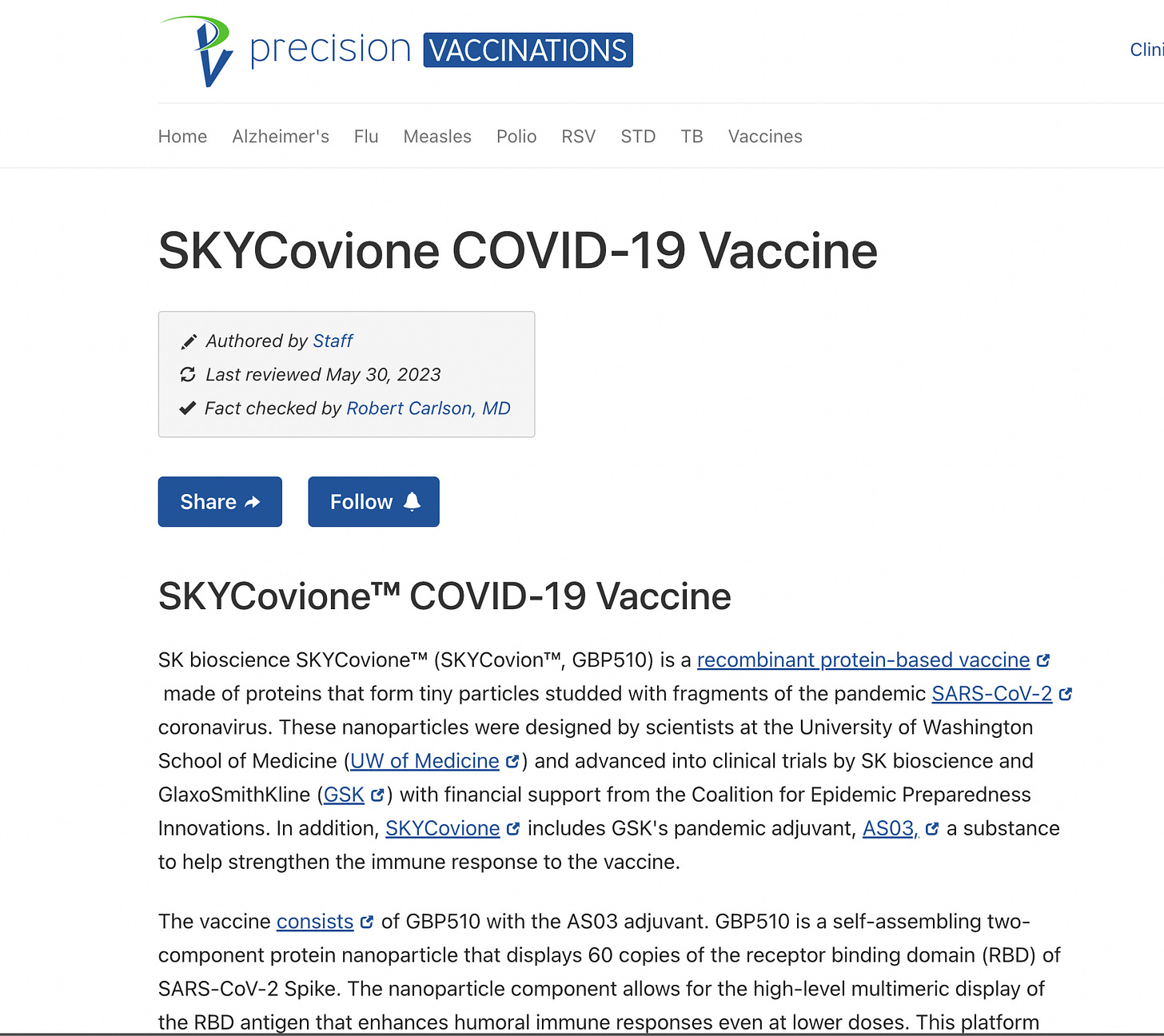 SKYCovione(TM) is a self-assembled nanoparticle vaccine targeting the receptor binding domain of the SARS-CoV-2 Spike protein for the parental SARS-Cov-2, jointly developed with the Institute for Protein Design (IPD) at the University of Washington School of Medicine with combination of GSK's pandemic adjuvant. The development of SKYCovione(TM) has been supported by funding from the Bill & Melinda Gates Foundation and Coalition for Epidemic Preparedness Innovations (CEPI).