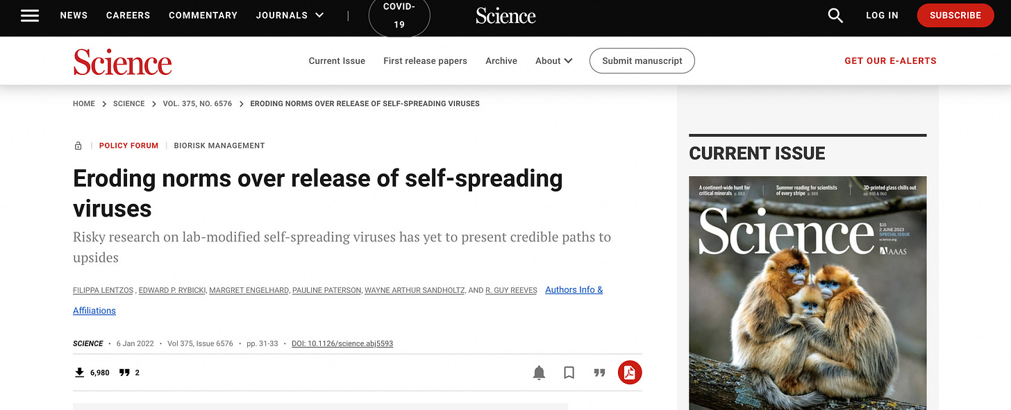 “It is clear that a single unwanted introduction of a GM [genetically modified viral] biocontrol agent could have serious consequences. Once a persisting transmissible GMO is released (whether intentionally, legally, or otherwise), it is unlikely that it could be completely removed from the environment. The scientific community involved in developing GM biocontrols therefore needs to demonstrate a highly precautionary attitude. Scientists also have an ethical responsibility to consider the full implications of the solutions they are researching: they must be seen to be acting openly, collaboratively and responsibly” (6, p. 583).