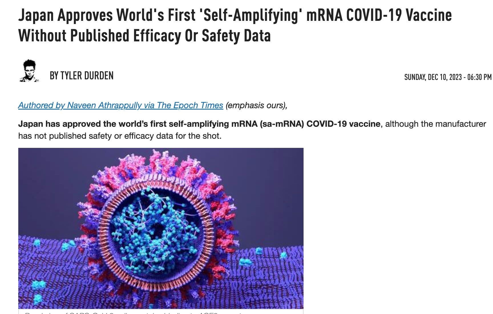 Toby Young, general secretary of the Free Speech Union, a public interest group, pointed out in a Nov. 30 X post that the sa-mRNA vaccine was approved in Japan “despite only testing it on 800 people, no control group and only checking antibody levels not infection rates. Medicine regulation died with Covid.”
