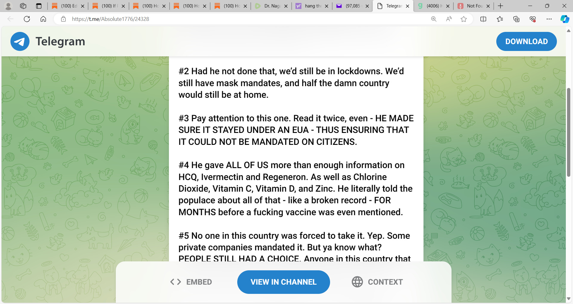 Trump continually says it's up to you whether you want the vaccine or not. There are still millions out there that think the death jab works. I MYSELF KNOW PEOPLE WHO ARE DOUBLE VAXXED AND BOOSTED WHO ARE FINE, AND I ALSO KNOW PEOPLE WHO HAVE DIED POST VAXX.