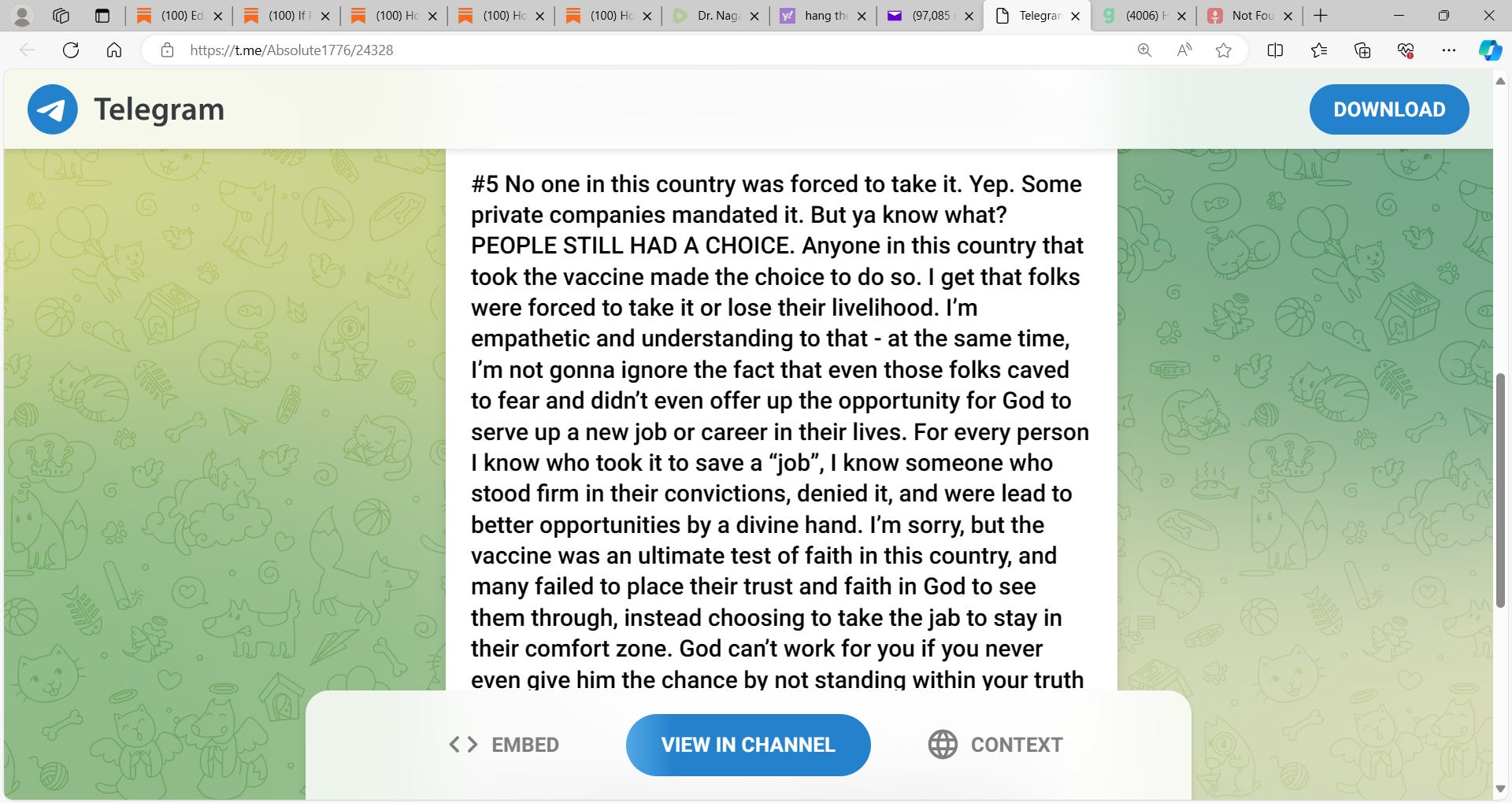 Playing devilโs advocate the kindest thing I can say is, Trump knows he needs every vote he can get. And, he will lose more votes by bashing vaccines than praising them. Vaccine skeptics will tisk-tisk but vote for him anyway. Vaccine advocates would disown him as a murderer if he came out against the shots. A recent poll by the major newspaper in my town indicated most still believe millions died from Covid. The comment section was rife with people who expressed disdain for those โselfishโ folks that put their notions of individual liberty ahead of people dying. I had to stop reading because the stupidity was so strong. But alas they vote. So like it or not Trump has to pander to these retards. And there are a lot more of them than even I care to admit.