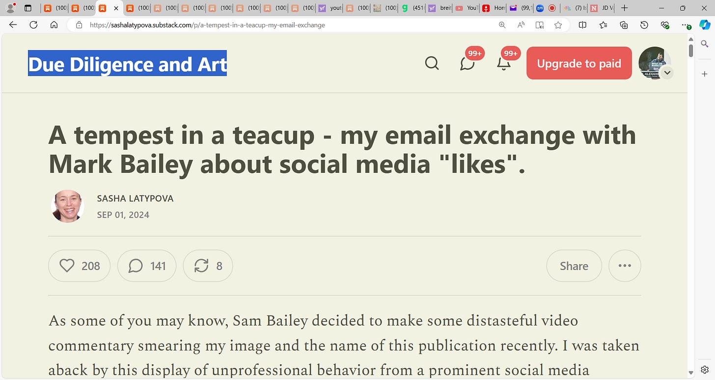 Sasha Latypova under attack in media & her response, respectful, huge praise to her, props! "A tempest in a teacup - my email exchange with Mark Bailey about social media "likes". printed in Due