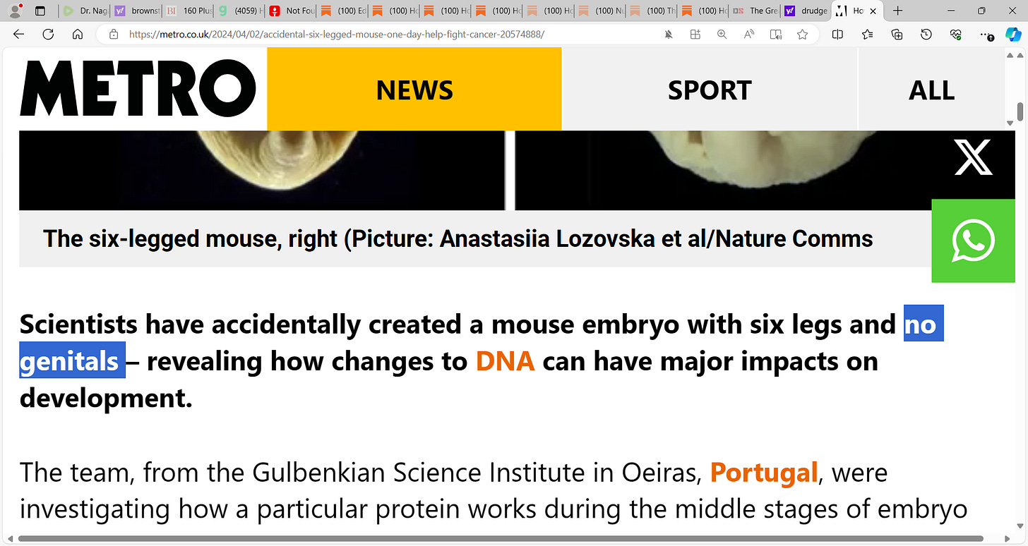 Scientists accidentally created a six-legged mouse with no genitals...the good news about this is that they actually by accident, created a version of the Republican Congress House members & speaker,