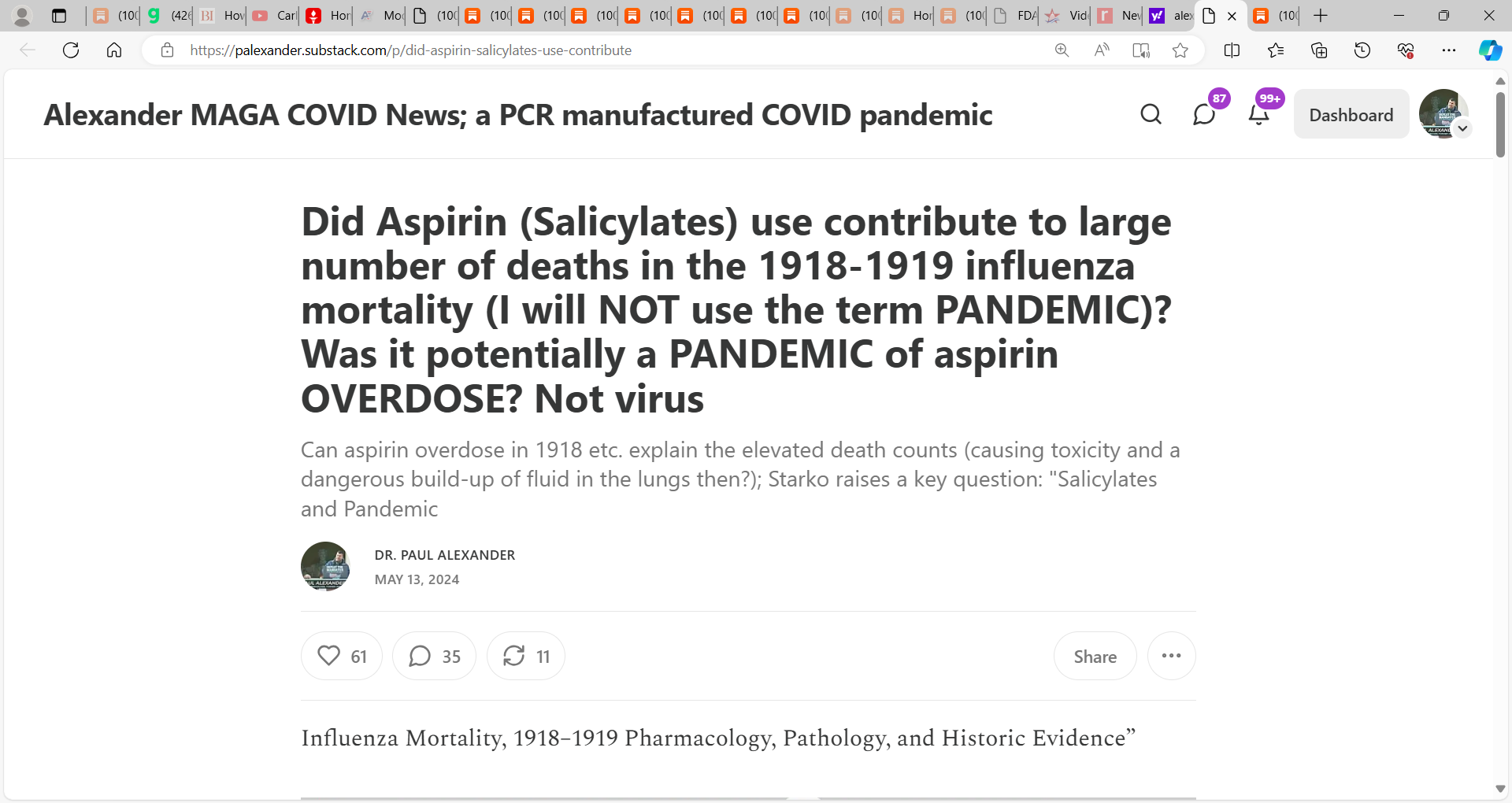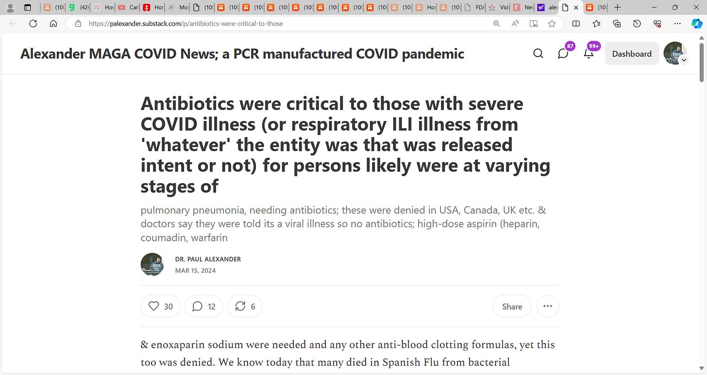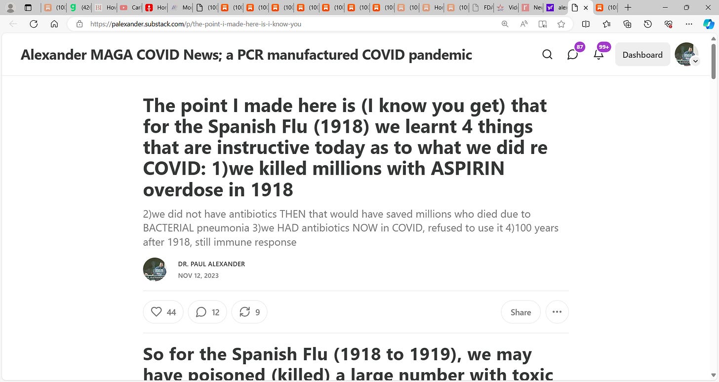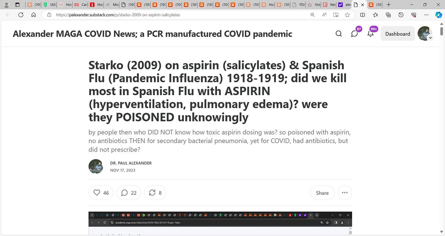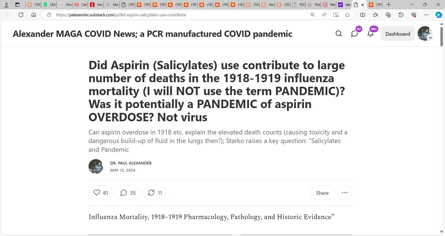 See my prior substacks on Spanish Flu being likely due (deaths) not to an influenza virus (not a pandemic) but due to toxic aspirin use & no antibiotics for bacterial pneumonia; we may have killed