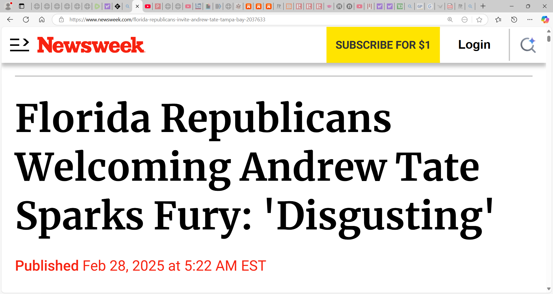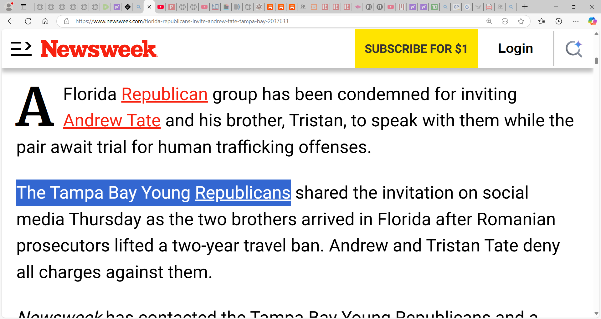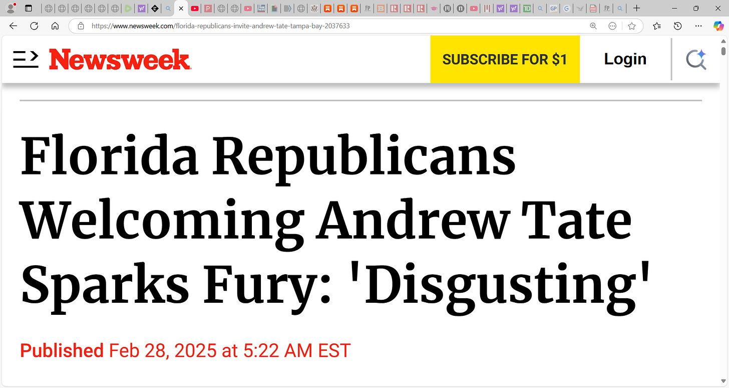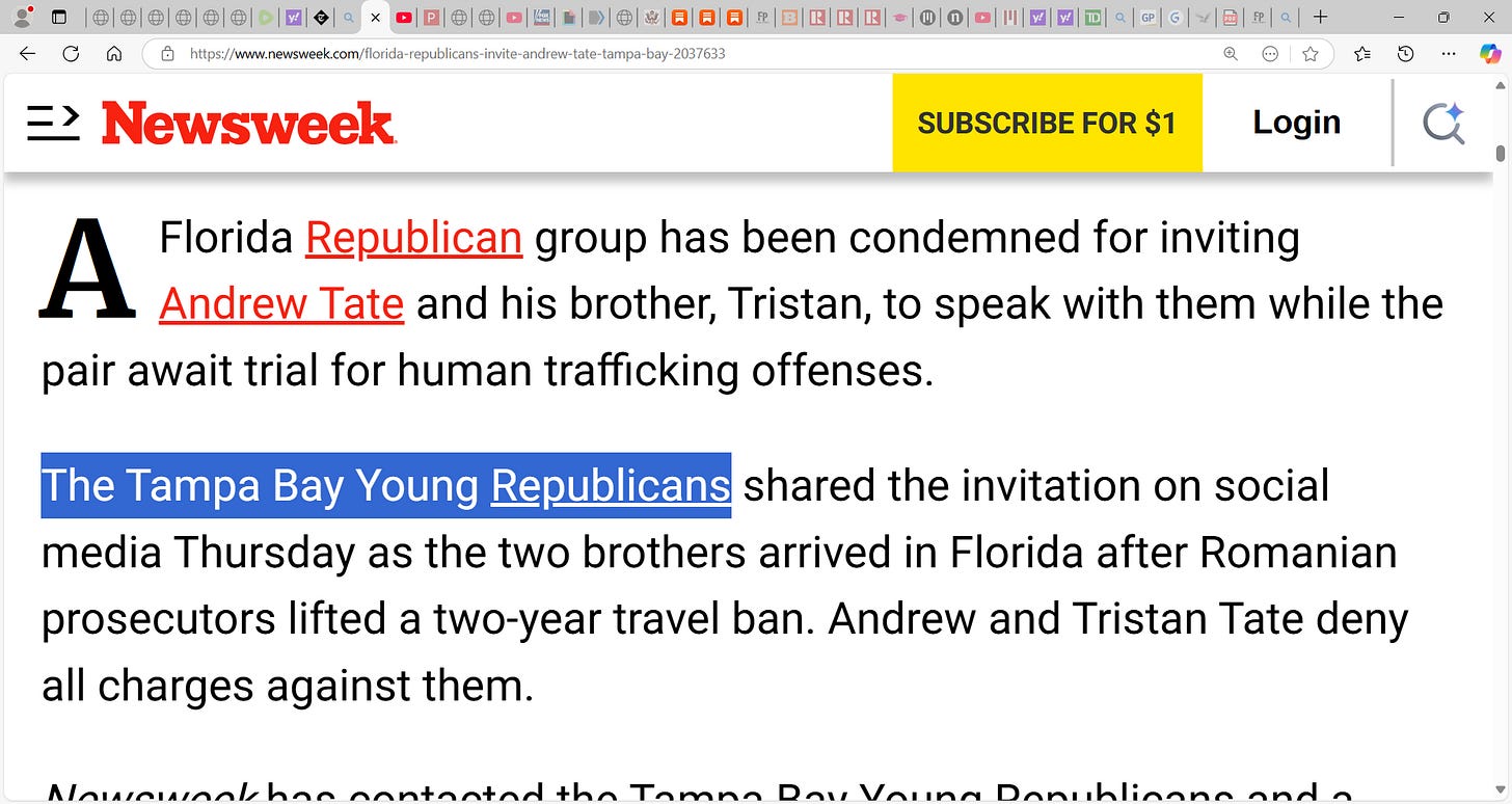 in Florida! Just based on public views & statements & behavior Trump cannot be part of this filth & for clicks & likes The Tampa Bay Young Republicans invited them? hosting Tate? Filthy, shame on TBYR