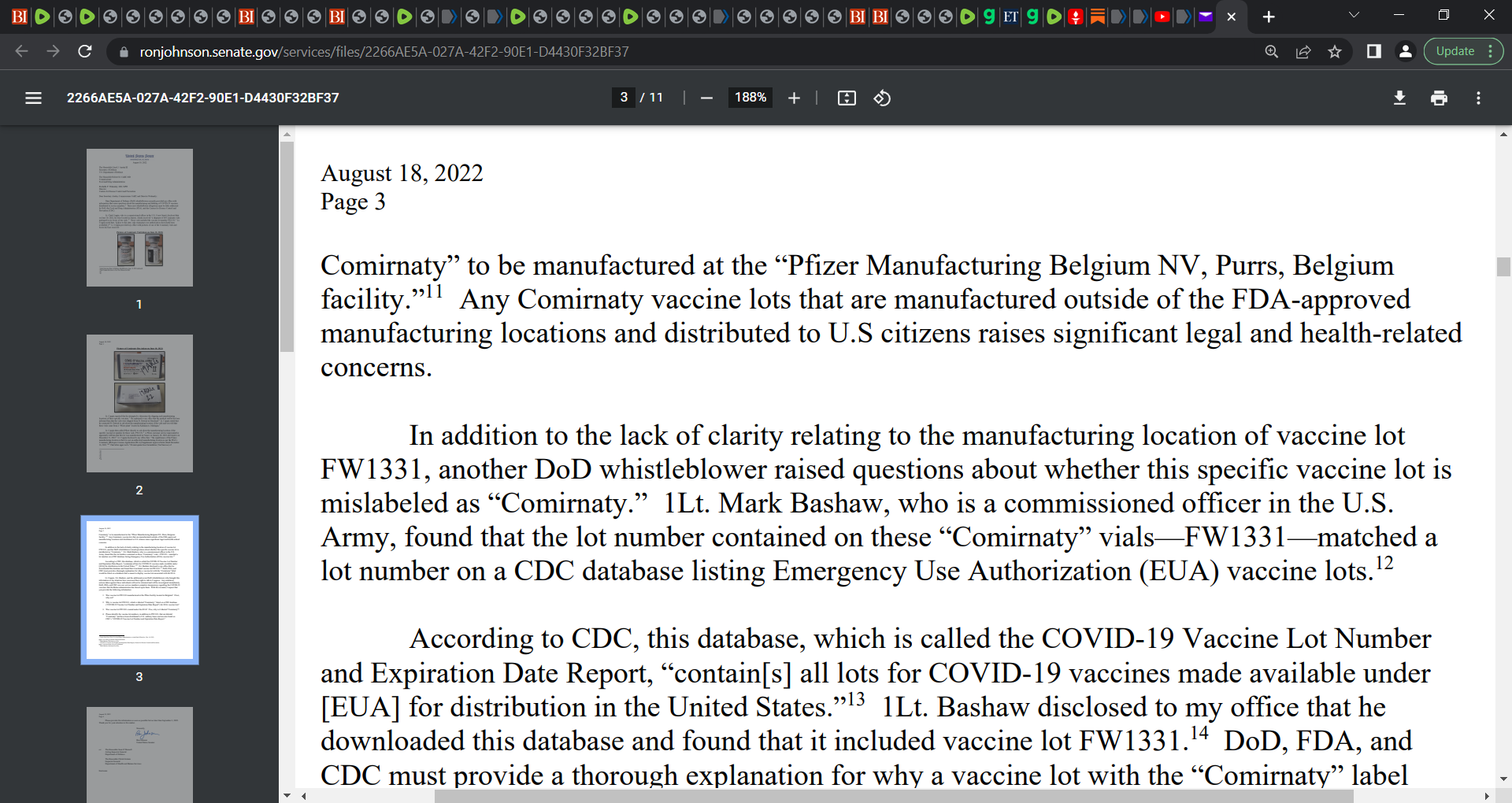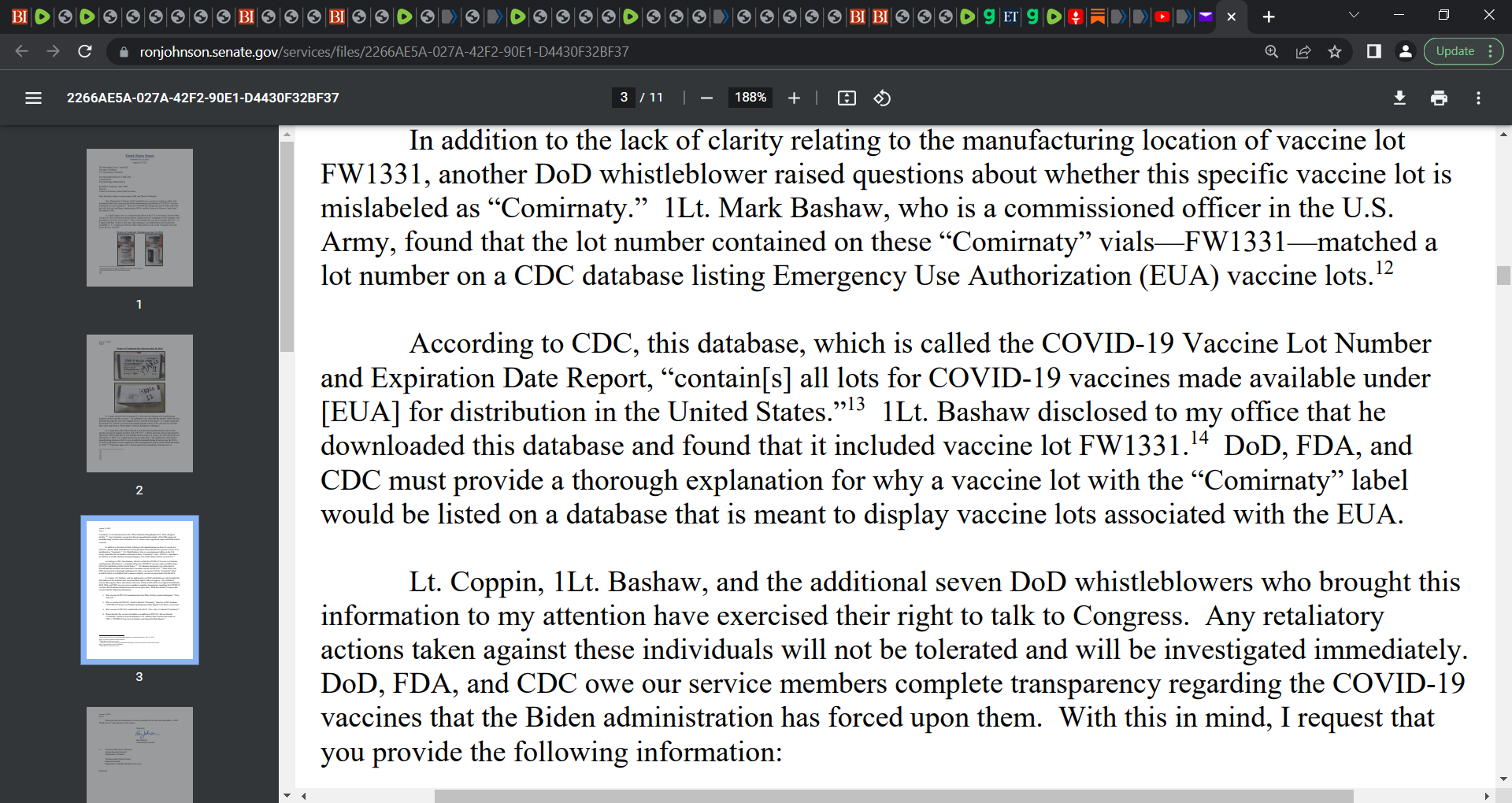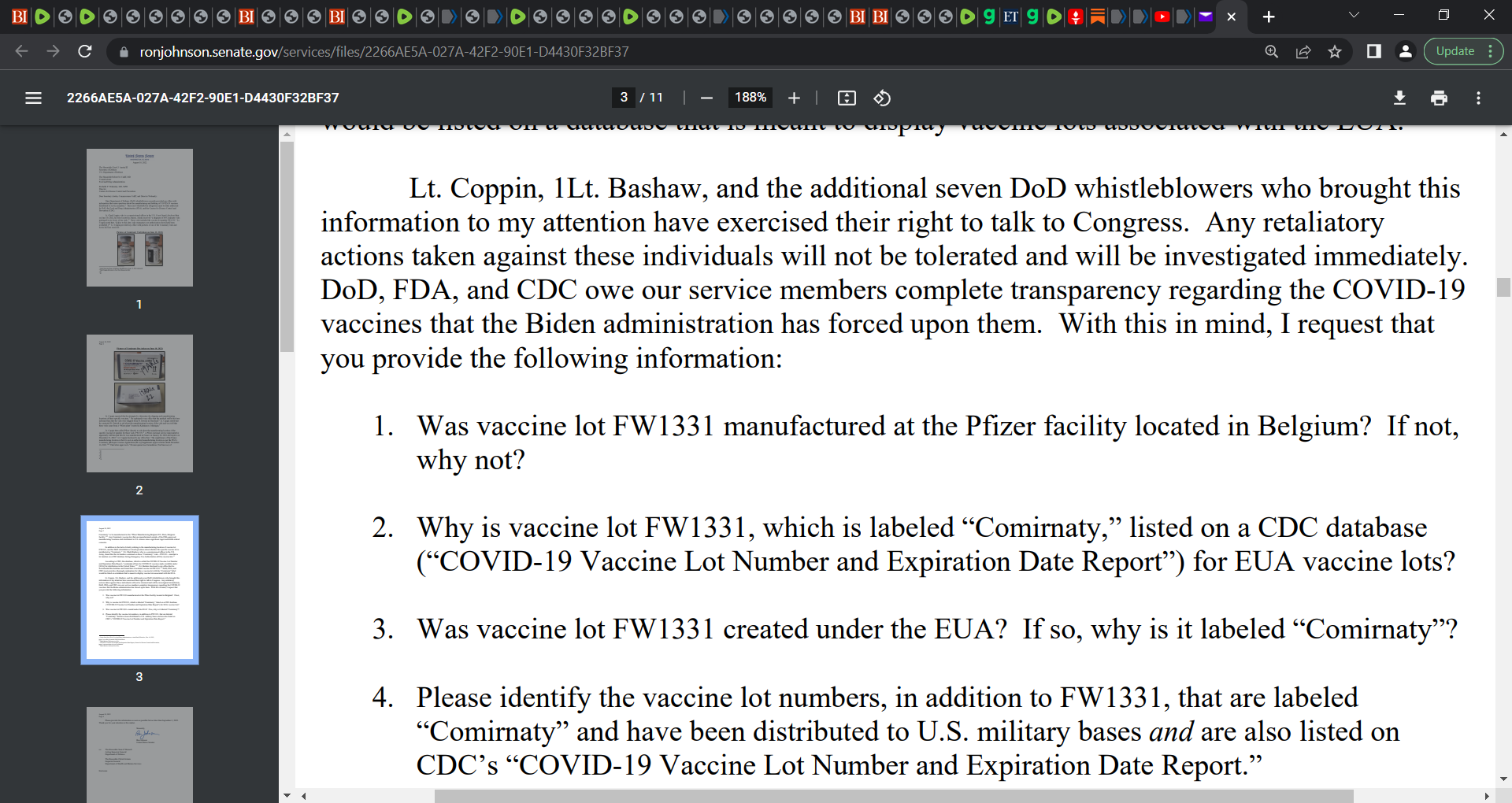 Sen. Johnson to DoD, FDA, CDC: "Whistleblower Allegations about COVID-19 Vaccine Mislabeling and Unauthorized Manufacturing Must be Fully Addressed; On Thursday, U.S. Sen. Ron Johnson (R-Wis.) sent a