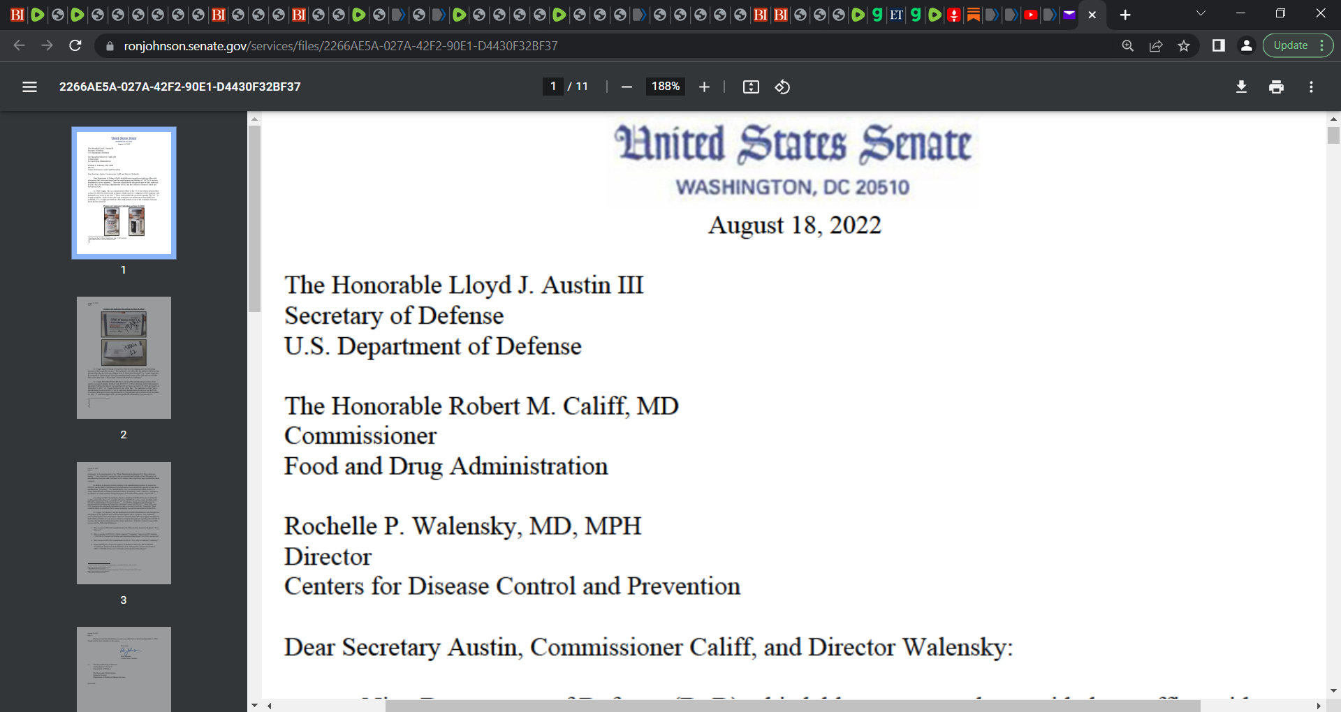 a letter to Department of Defense (DoD) Secretary Lloyd Austin, FDA Commissioner Robert Califf, & CDC Director Rochelle Walensky regarding concerns about mislabeling and unauthorized manufacturing