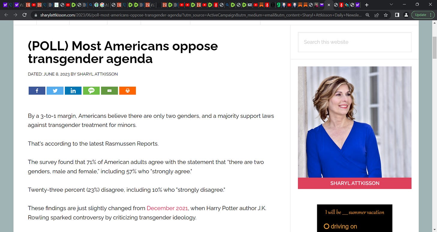 SHARYL ATTKISSON, fearless: "By a 3-to-1 margin, Americans believe there are only two genders, and a majority support laws against transgender treatment for minors.That's according to the latest