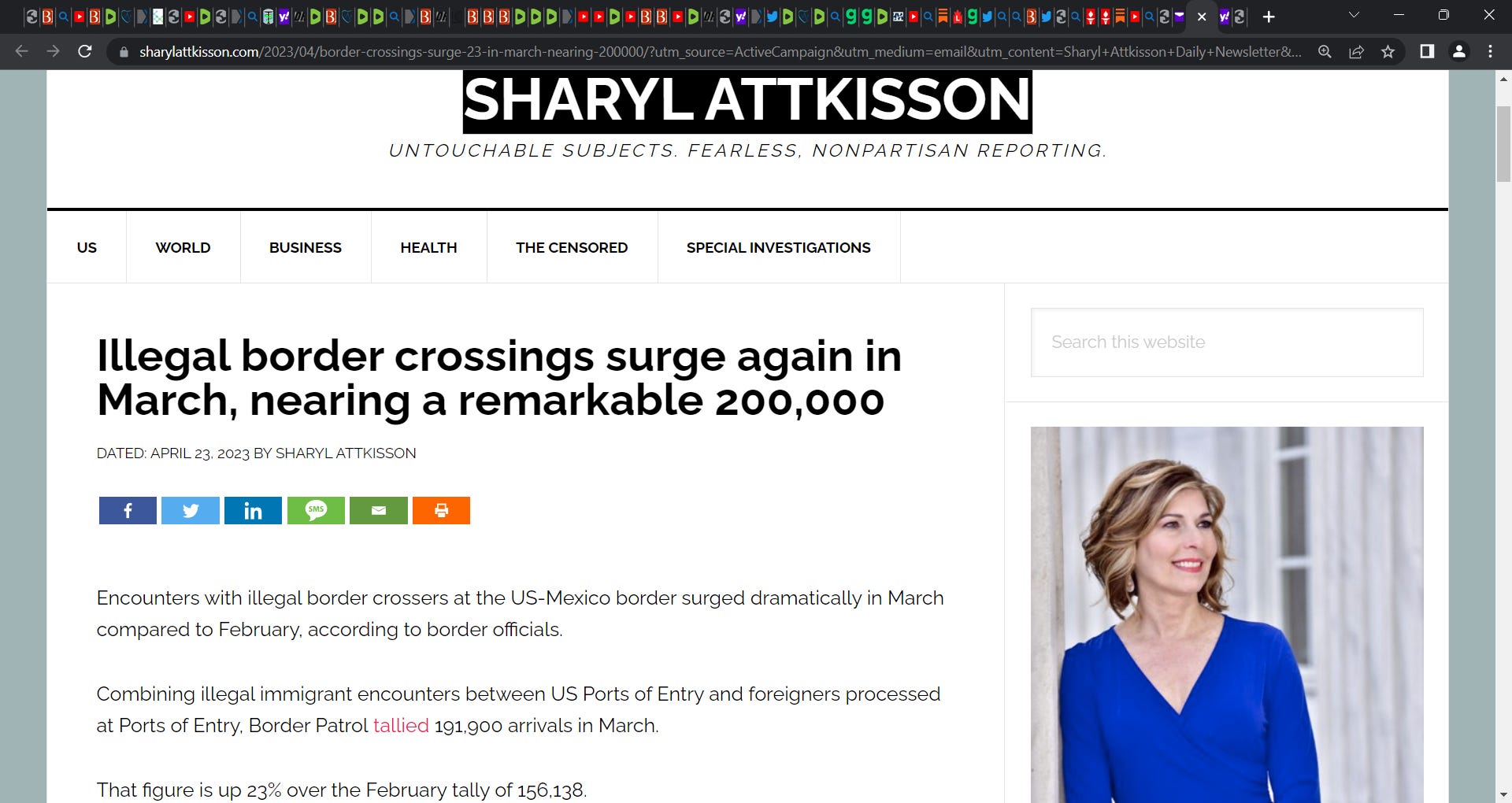 SHARYL ATTKISSON highlights that illegal border crossings are surging 'while we sleep', up 200,000 in March; Obama flooded us with jihadists, Biden doing it with illegals (& jihadists & Chinese too)