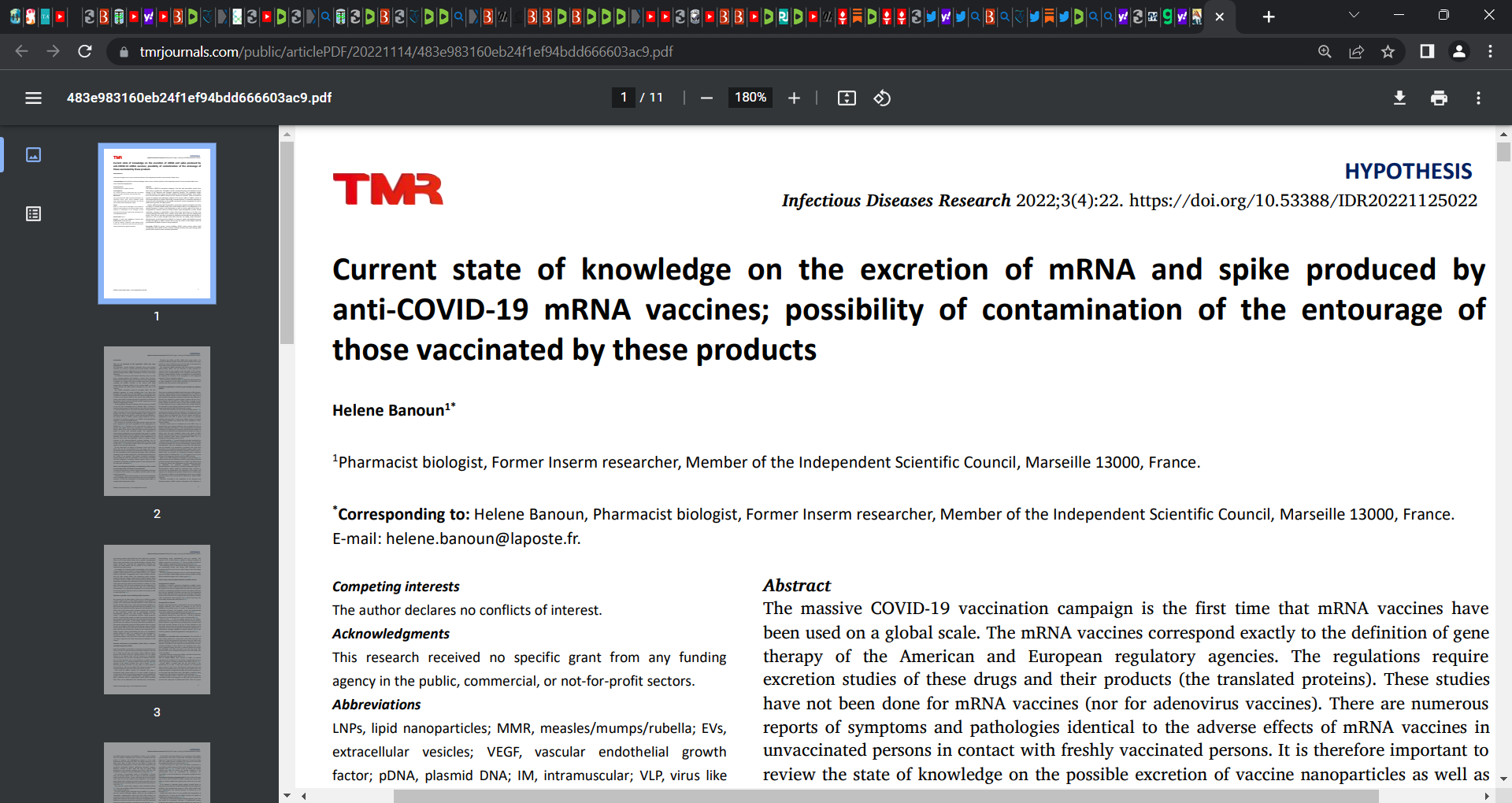 ‘Vaccine mRNA-carrying lipid nanoparticles spread after injection throughout the body according to available animal studies and vaccine mRNA (naked or in nanoparticles or in natural exosomes) is found in the bloodstream as well as vaccine spike in free form or encapsulated in exosomes (shown in human studies). Lipid nanoparticles (or their natural equivalent, exosomes or extracellular vesicles (EVs)) have been shown to be able to be excreted through body fluids (sweat, sputum, breast milk) and to pass the transplacental barrier. These EVs are also able to penetrate by inhalation and through the skin (healthy or injured) as well as orally through breast milk (and why not during sexual intercourse through semen, as this has not been studied).’