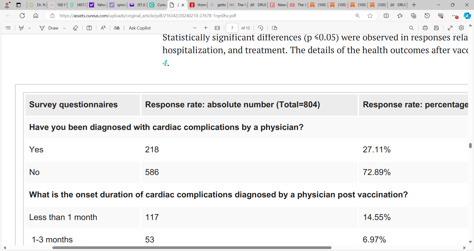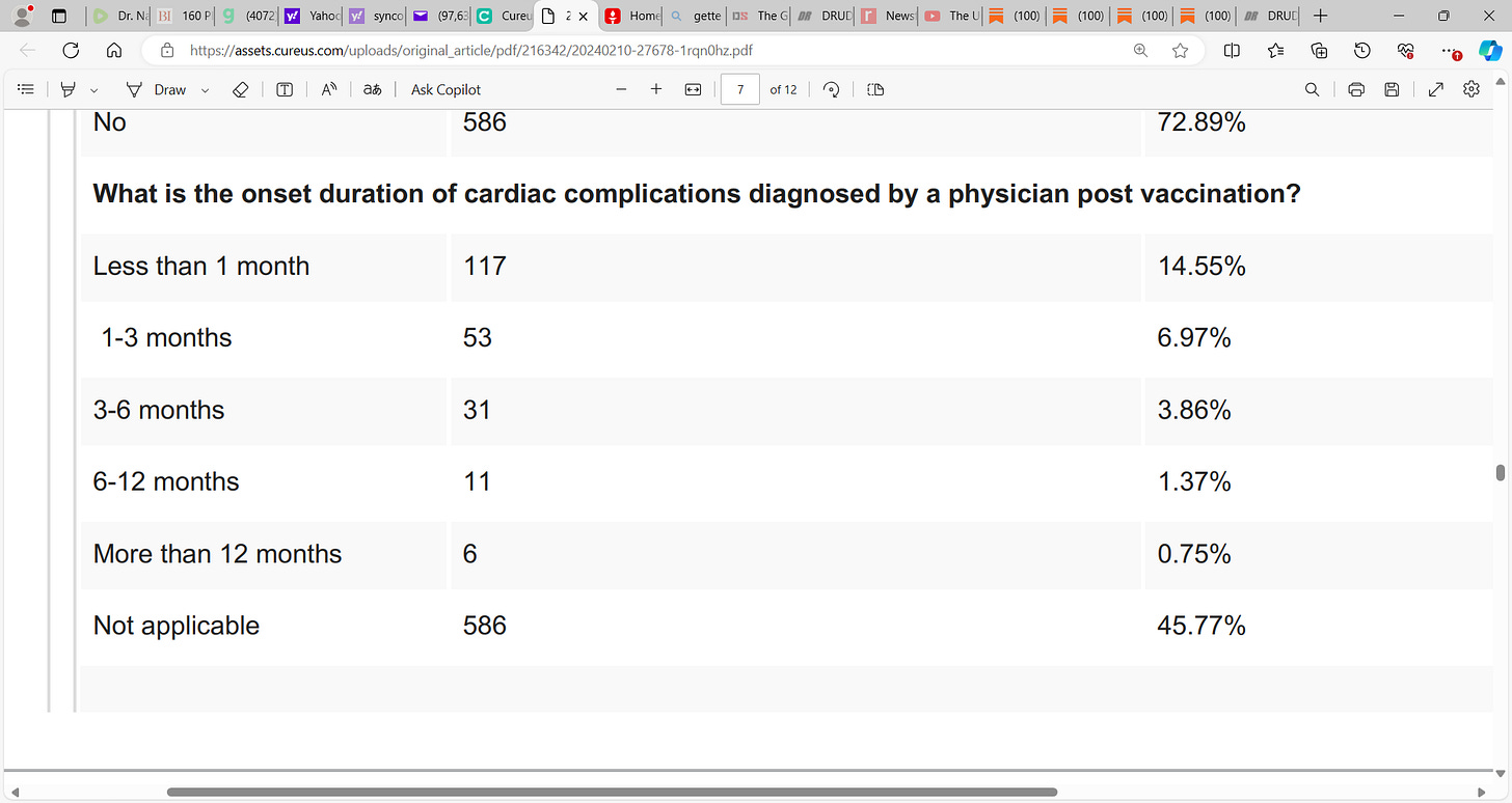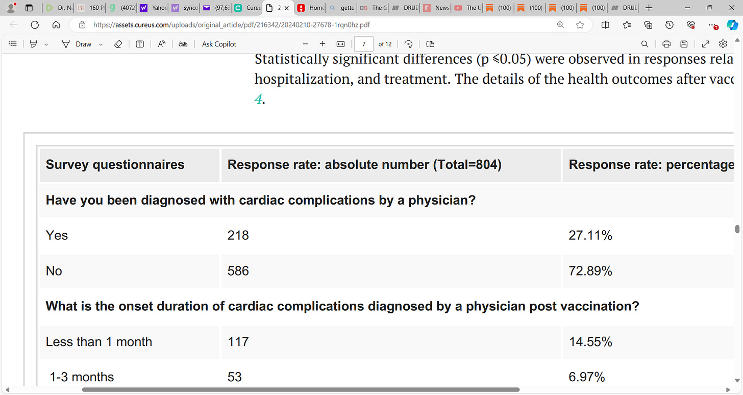 self-reported physician-diagnosed cardiac complications post mRNA vaccination; 747 (92.79%) vaccine uptake & alarming frequency of 218 (27.11%) reporting cardiac complications; see McCullough's stack