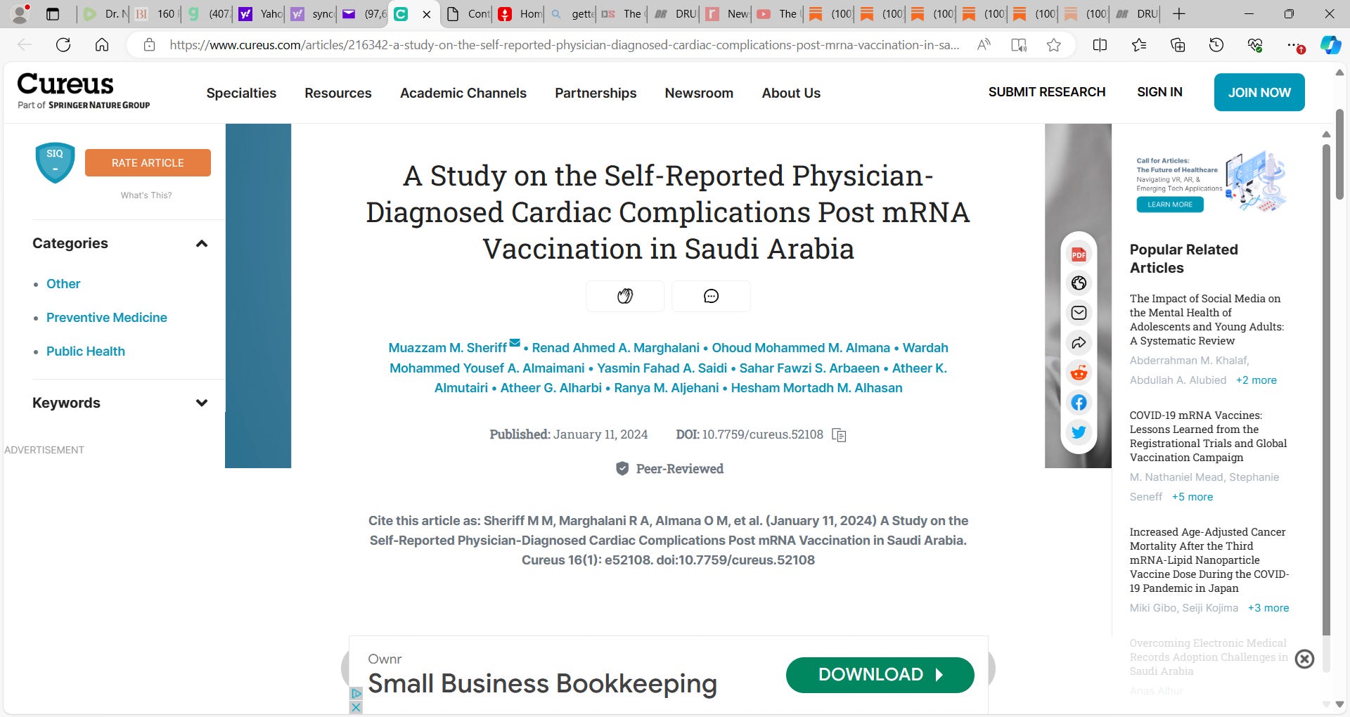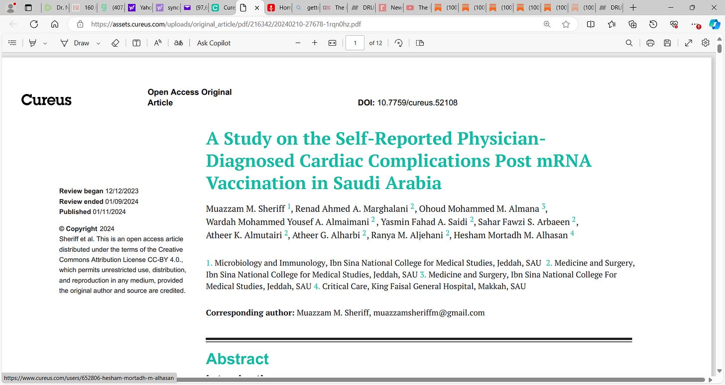 Sheriff et al. very troubling CUREUS publication on self-reported cardiotoxic effects of the MODERNA & Pfizer BioNTech mRNA technology gene injection in Saudi Arabia