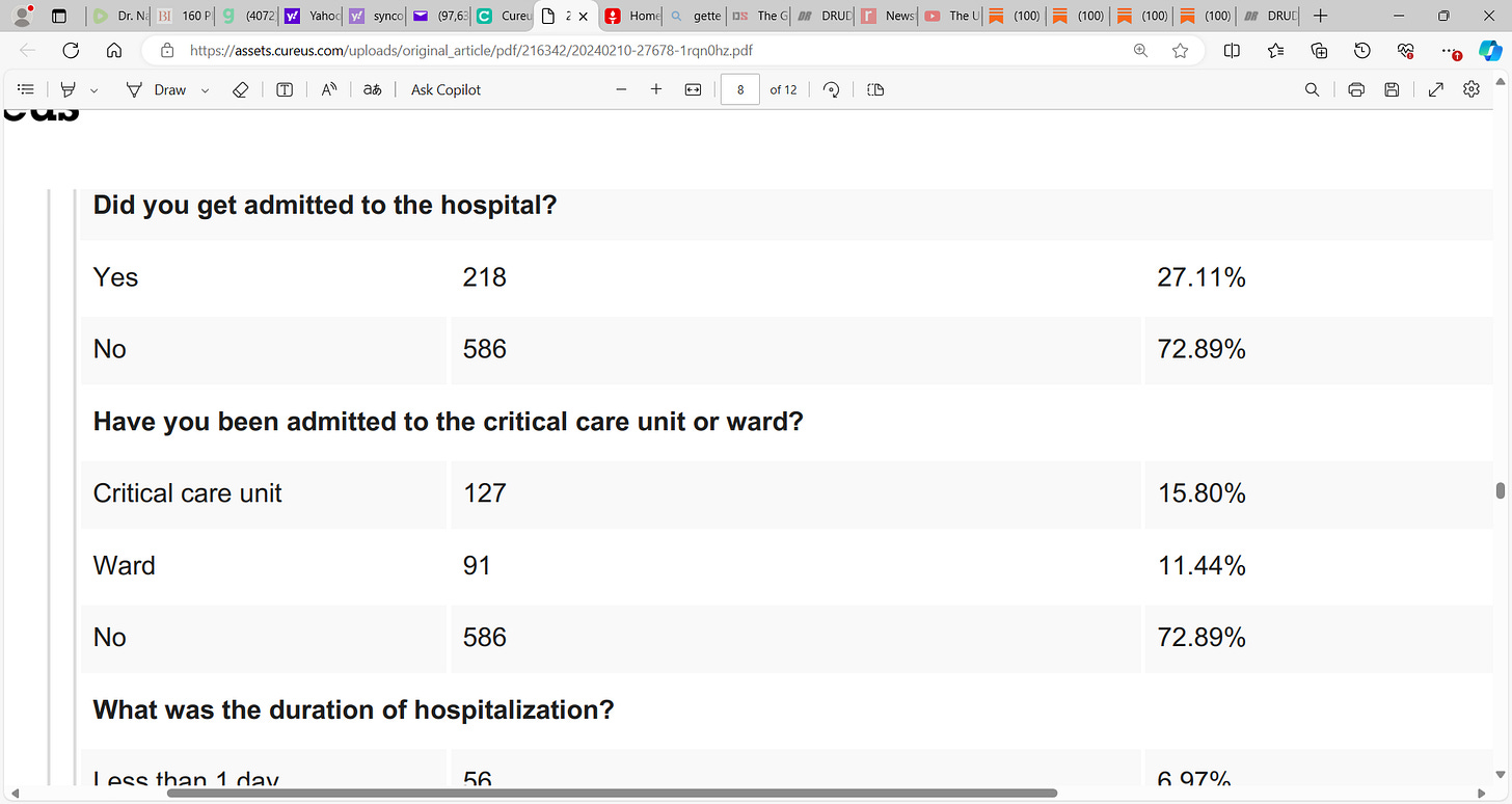 “More than half indicated they were influenced by a healthcare professional or government agency to get vaccinated. As you can see, 27.1% suffered cardiovascular symptoms warranting hospitalization with 15.8% landing in the intensive care unit. Despite the bias of recruitment strategy to find patients with cardiovascular side effects from mRNA, these are large percentages requiring hospital and or ICU care. Never in recent times has there been such a cardiotoxic vaccine released on the public. More data are needed on these cases including diagnosis, treatment, and outcomes such as recurrent hospitalization and death.”