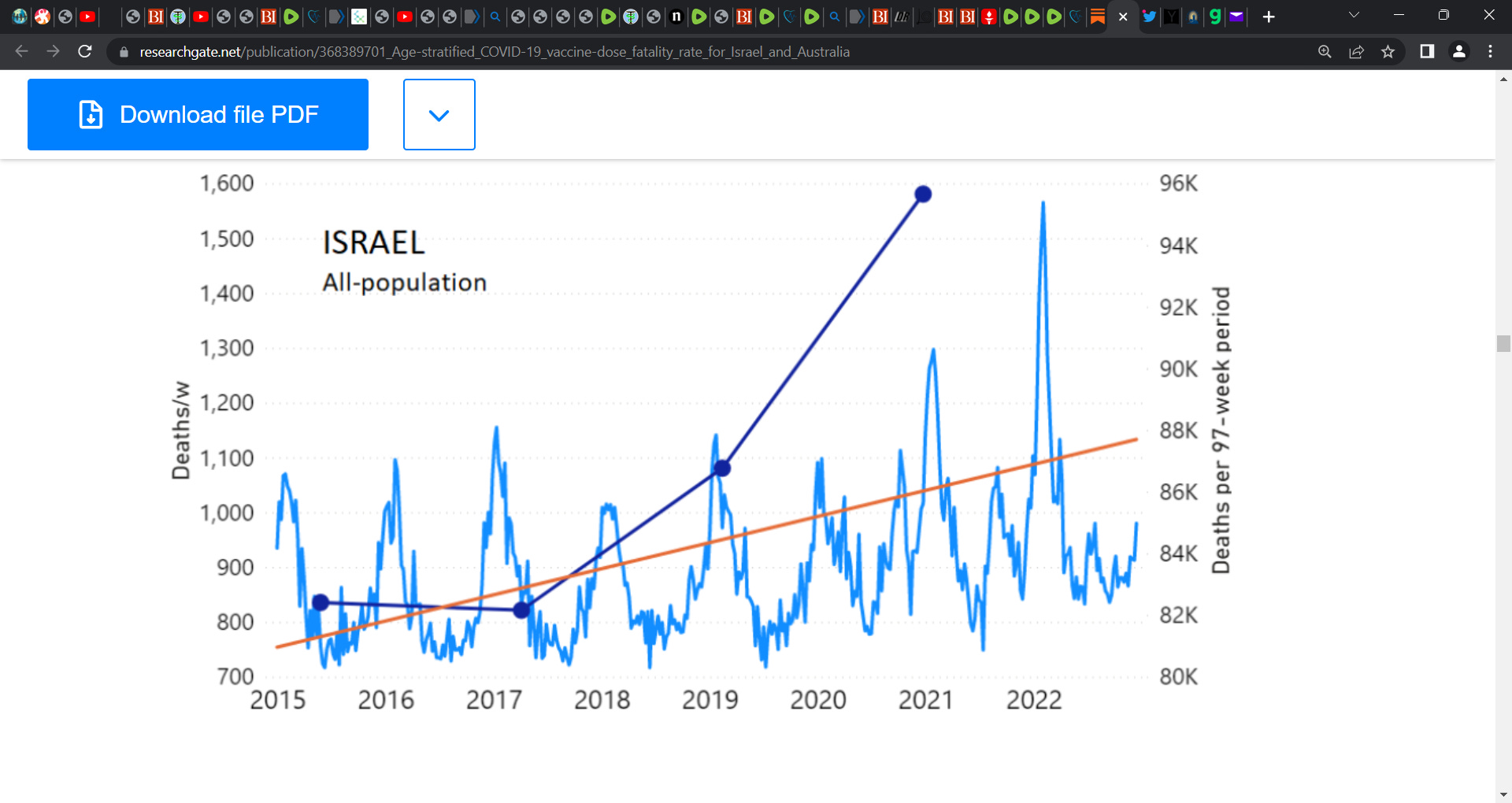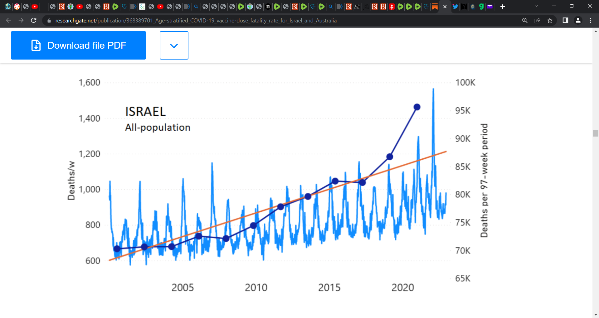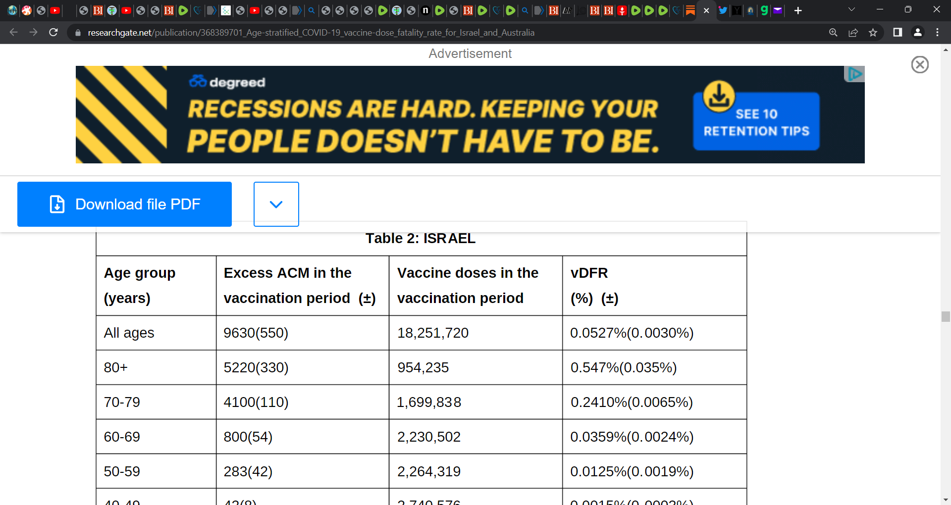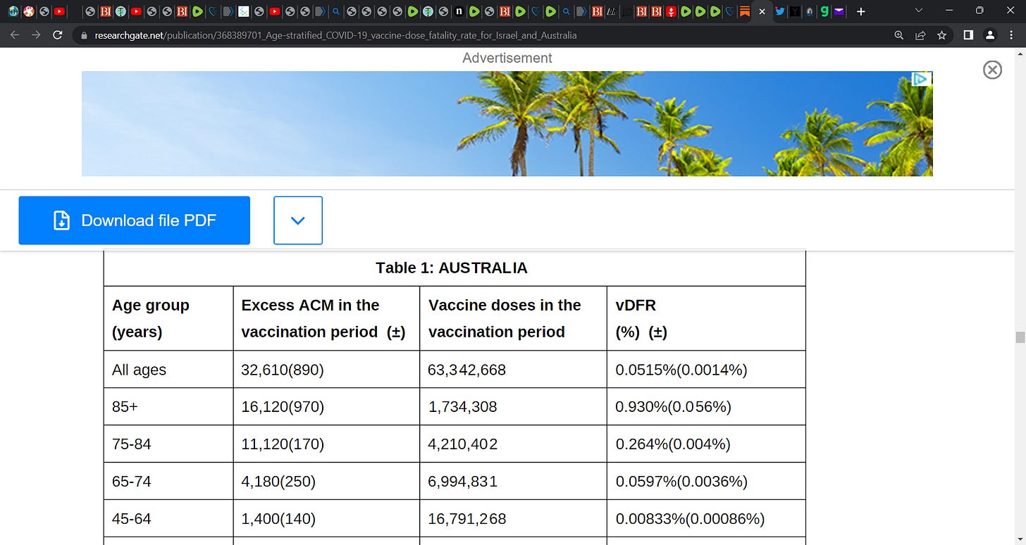 “It is now well established from autopsy studies and adverse effect monitoring that the COVID-19 vaccines can cause death. The vaccine-dose fatality rate (vDFR), which is the ratio of vaccineinduced deaths to vaccine doses delivered in a population, has recently been measured by us to be as large as 1 % in India and when “vaccine equity” campaigns were applied in high-poverty states of the USA, and to be 0.05 % in Australia, with data that is not discriminated by age group. Here, we provide the first empirical evaluations of age-stratified vDFRs, using national all-cause mortality and vaccine rollout data, for Israel and Australia.