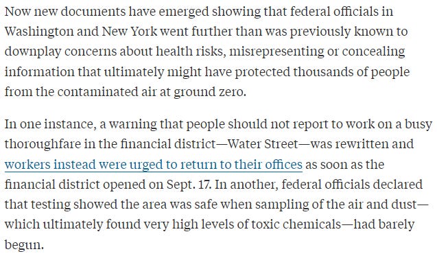 Remembrance, Too The perfect day to remember what happened AFTER September 11th"; "On September 12, we should steel ourselves remember what came next." Difficult content linked to regard for victims