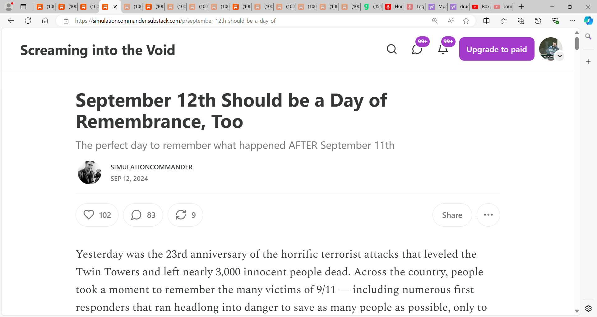 Nice sentiment in remembering September 12th. That said, it fails to recall something even more significant and that would be what happened on September 10th - which after the events unfolding of September 11th have seemingly been totally eclipsed in the memories of most. What is it that was so significant on September 10th that the events of September 11th served to distract attention from? That would be Donald Rumsfeld stating in a press conference that the Defense Department cannot account for trillions of dollars. THAT is something that must ALSO be remembered every day following the devastating attack on American soil in NYC as well. (note: others have said as much and have been labeled as conspiracy theorists - a moniker carefully crafted by the intelligence community to dismiss pesky details such as truth and facts. https://rumble.com/v5ejos4-september-11-2001-conspiracy-theory-banned-on-youtube.html )