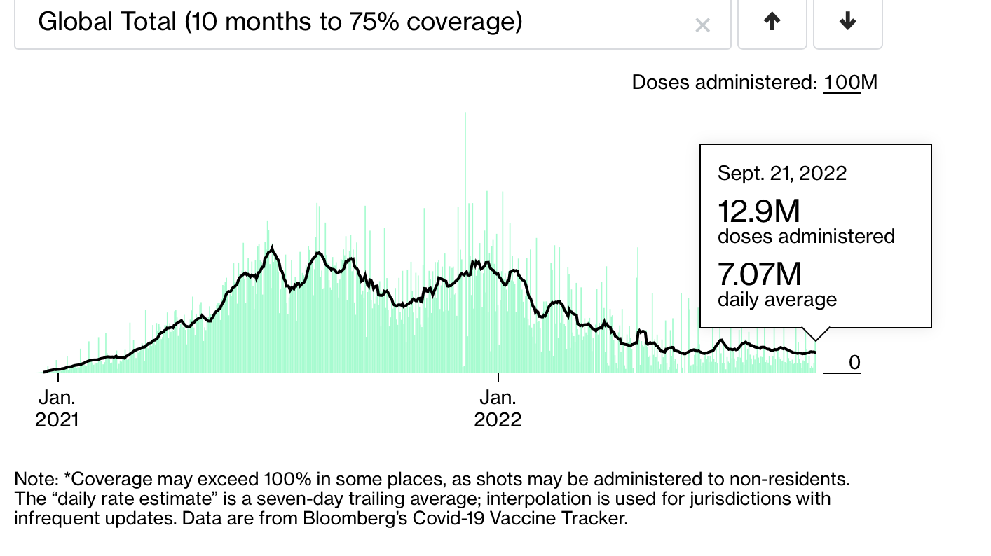 Over a two year period, more than 12.9 billion vaccine doses were administered across 184 countries (Bloomberg, September 21, 2022, see graph below).