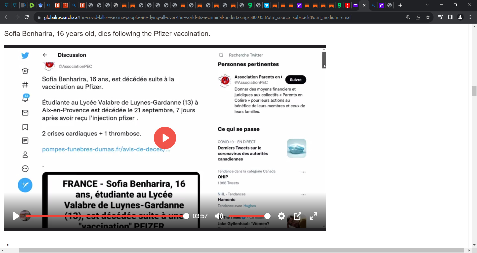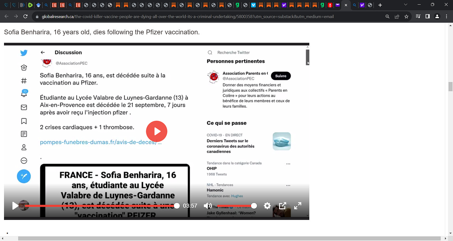 Sofia Benharira, 16 years old, dies following the Pfizer vaccination.