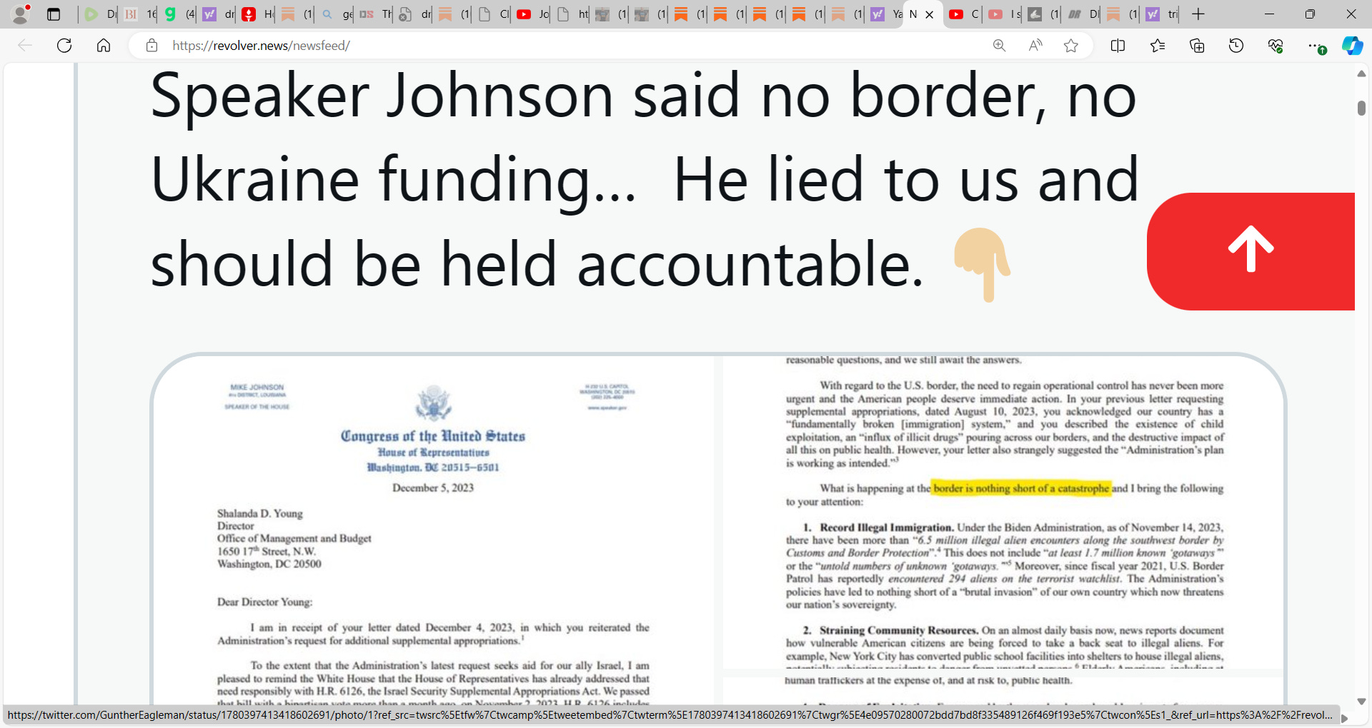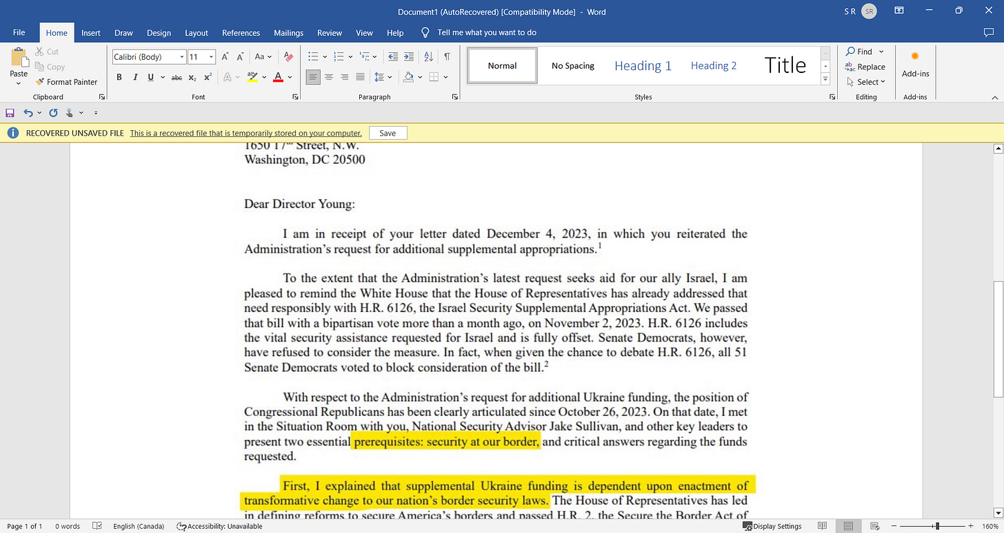 Speaker Mike Johnson lied, he defrauded the American people openly, see his letter December 5th 2023 where he said no border security, then no UKRAINE funding, yet he did the complete opposite, there