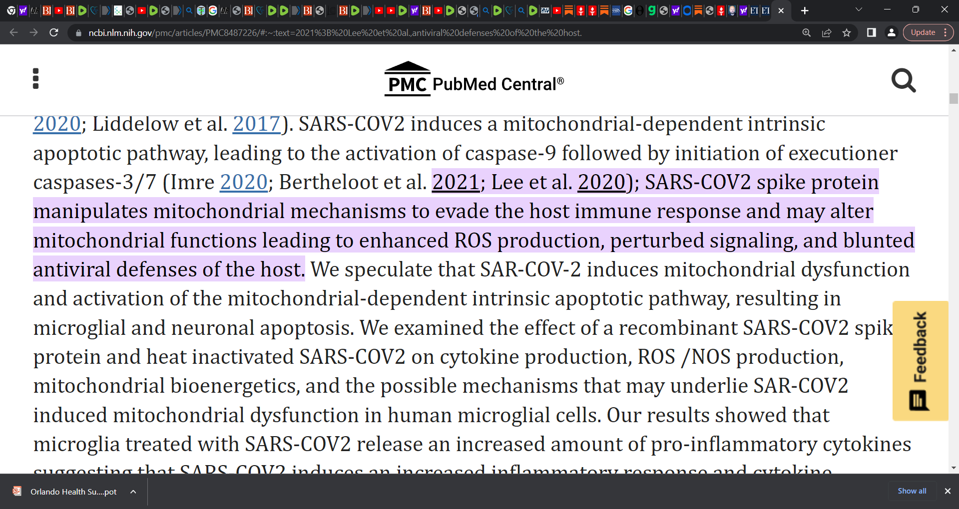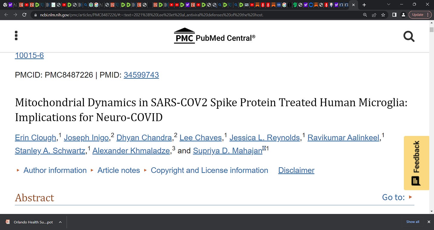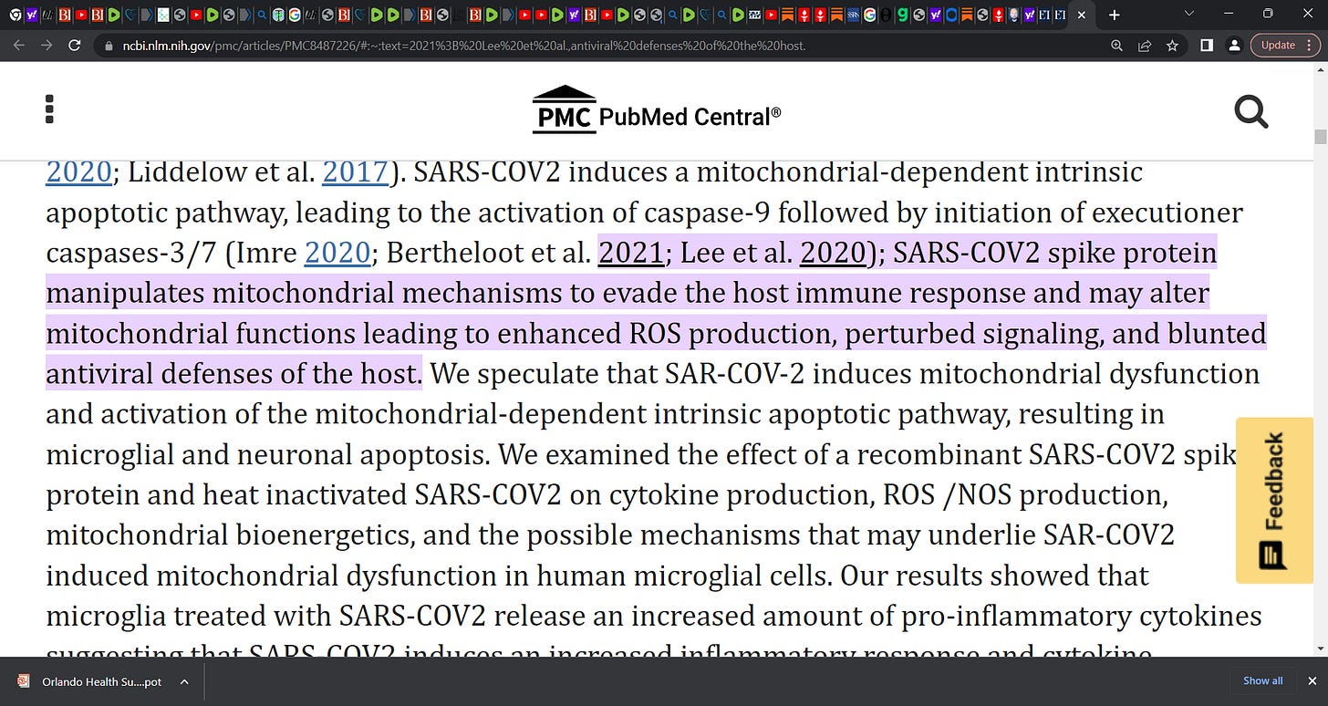 Spike protein (from mRNA shot or virus) may induce Mitochondrial damage & dysregulation, impacts cellular energy production, produces damaging oxidative species; can cause cell stress, even cell death