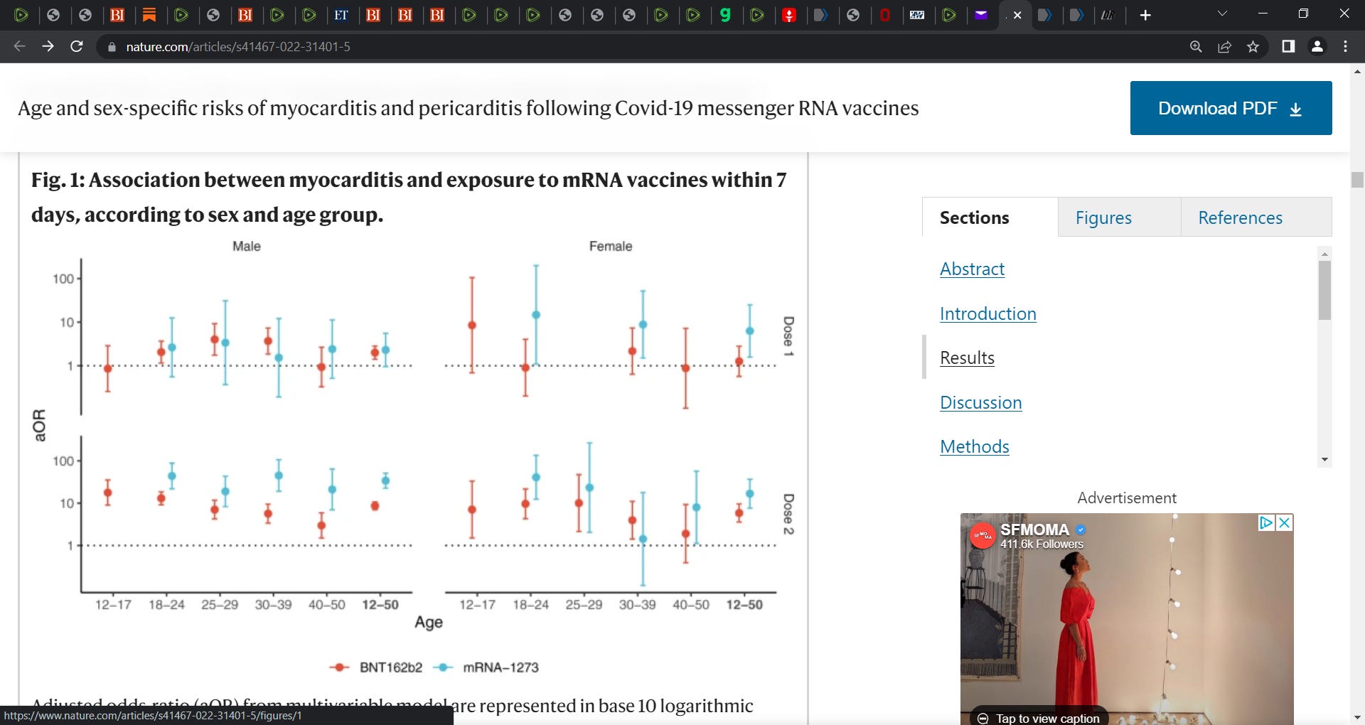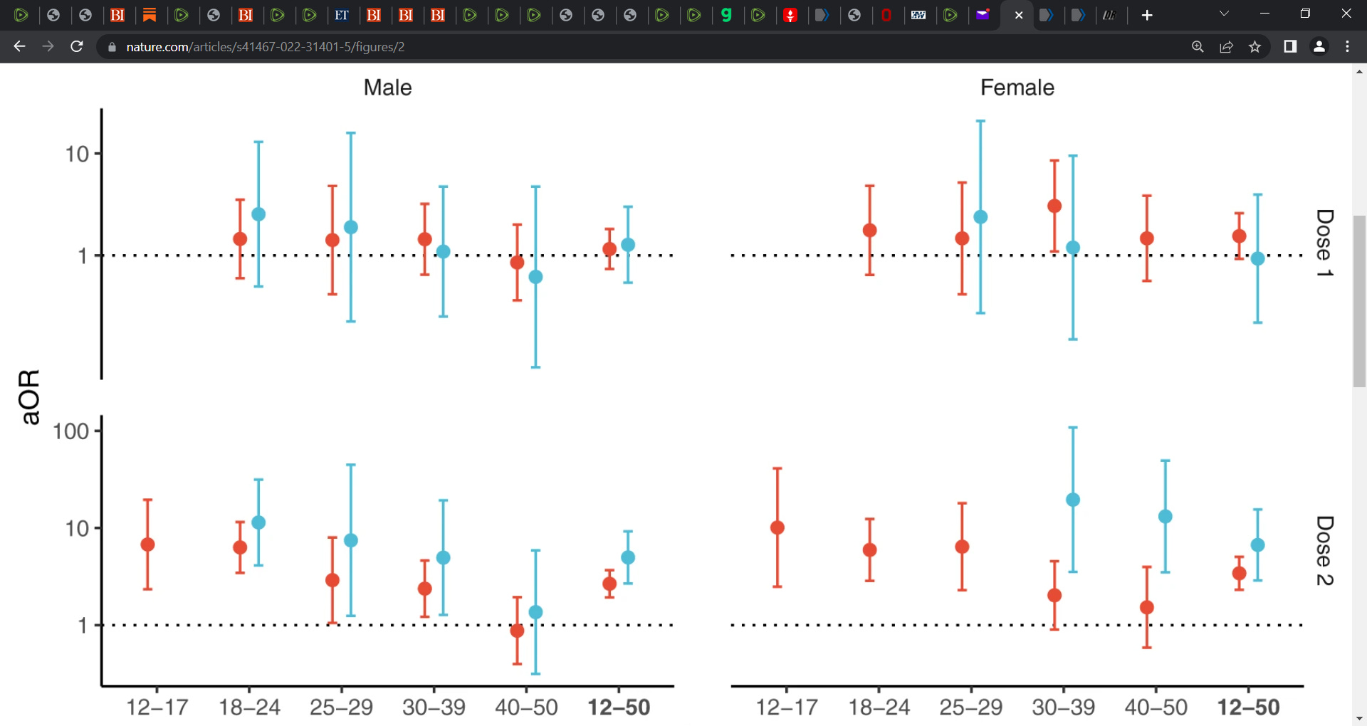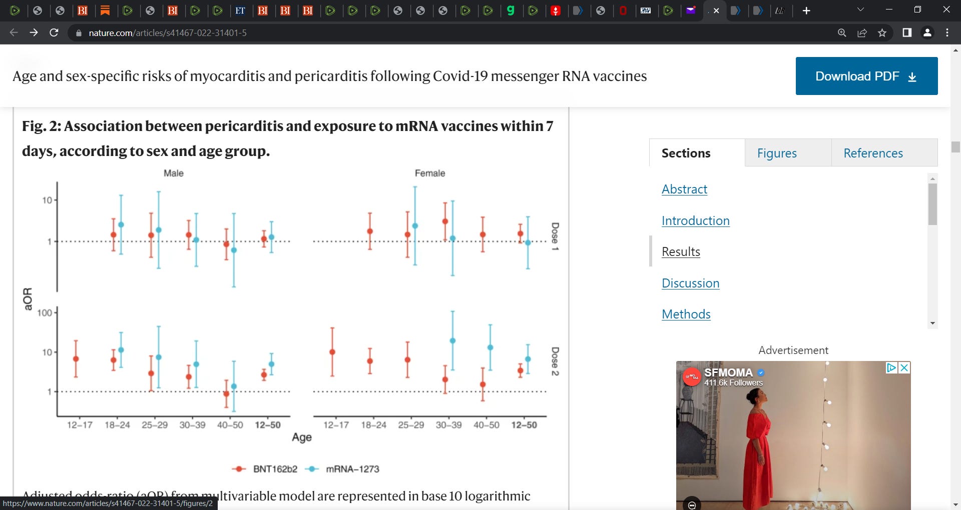An increased risk of pericarditis was also found in the first week after the second dose of either of the mRNA vaccines among both males and females (Fig. 2 and Table S3). Odds-ratios for the second dose of the BNT162b2 vaccine showed a downward trend across age groups with values up to 6.8 (95% CI, 2.3–20) and 10 (95% CI, 2.5–41), respectively in males and females aged 12 to 17 years. The second dose of the mRNA-1273 vaccine was associated with pericarditis among males and among females only within age 30 to 39 years (odds-ratio 20 [95% CI, 3.5–110]) and age 40 to 50 years (odds-ratio 13 [95% CI, 3.5–49]).’