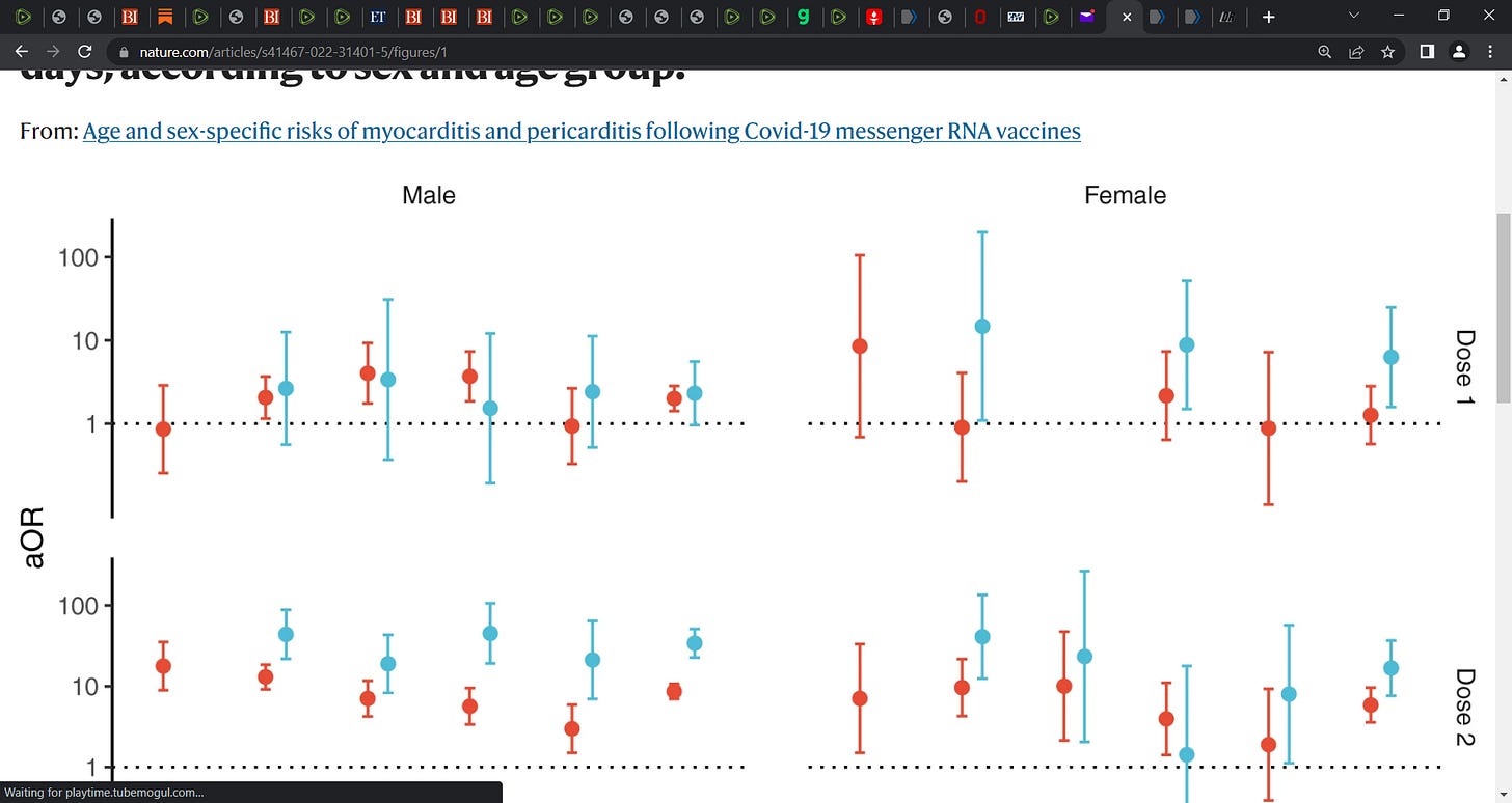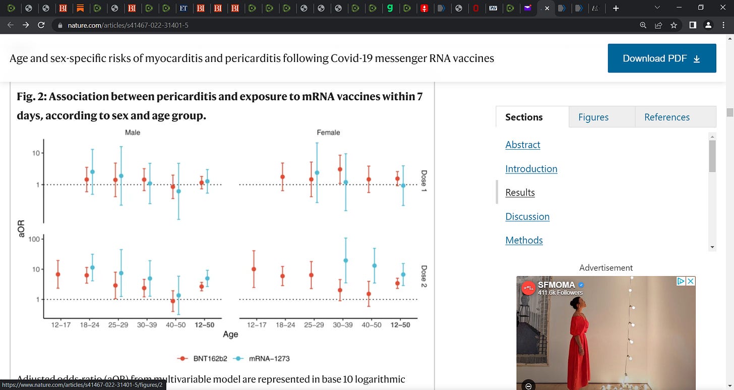 Bottom line and this study out today is telling us what we already knew from prior studies across the last over one year. The study shows that vaccination/injection/inoculation using both mRNA vaccines (Pfizer and Moderna) was related to an increased risk of myocarditis and pericarditis within the first 7 days post vaccination. The study showed that the relationships/associations were especially marked after the second dose, and were existent for both males and females. The study also revealed a trend of enhanced risks towards younger age groups. Moreover, a significant risk was also emerged among males greater than 30 years of age to develop myocarditis and among females over 30 years of age to develop a pericarditis post vaccination.