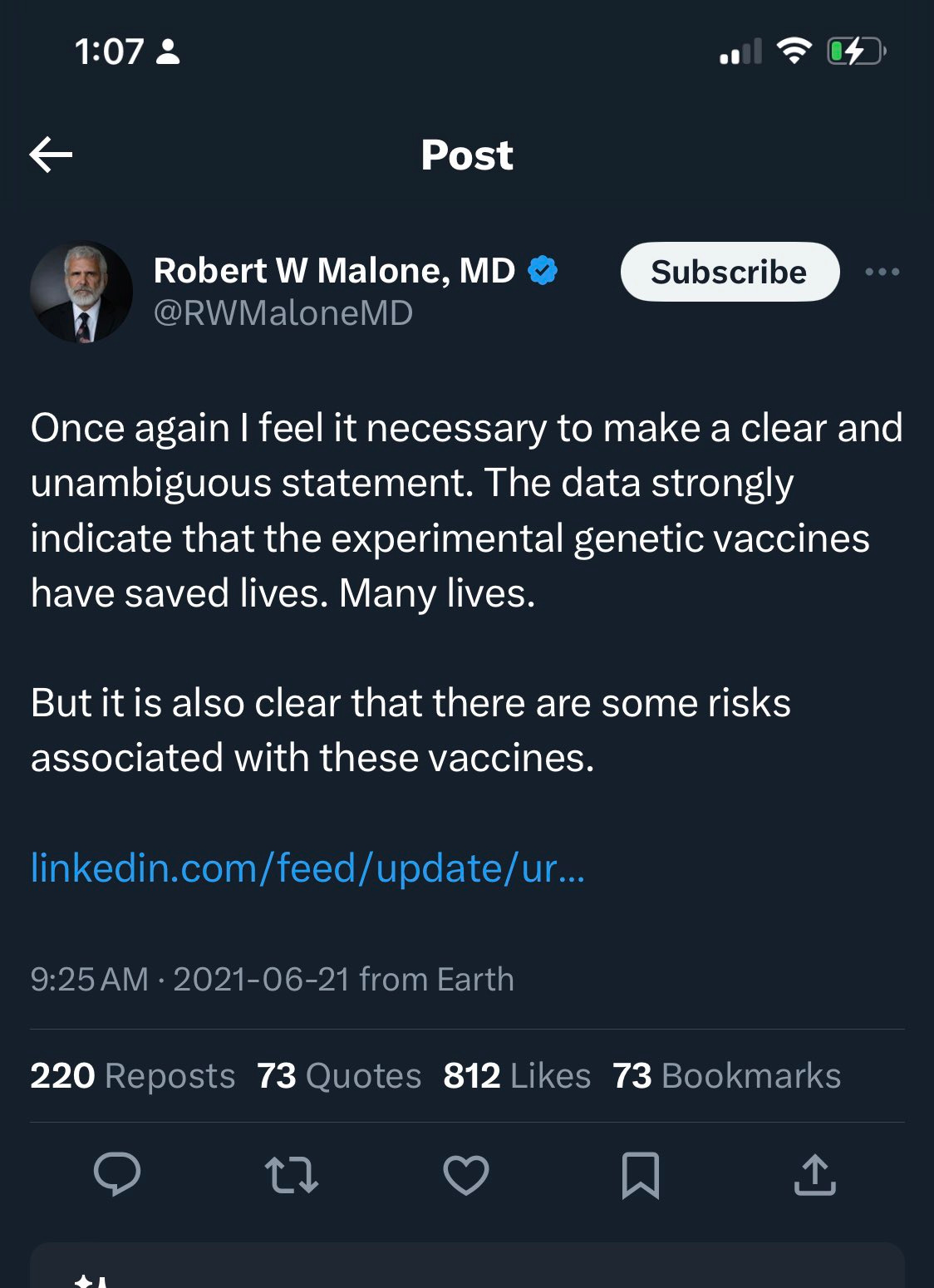 Stepstool Malone's TWATTER post that 1)unambiguous data showed that the mRNA vaccines saved lives...my question, where is the data?..my statement, you know you lied MALONE & it costed lives & people