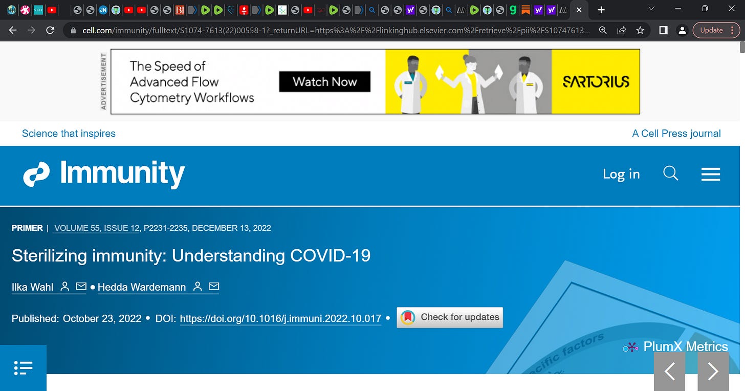 Sterilizing immunity 101: "Sterilizing immunity: Understanding COVID-19" (Wahl et al.); this paper has some very useful primer details, refresher and I thank Dr. Ramin Oskoui for pointing it out