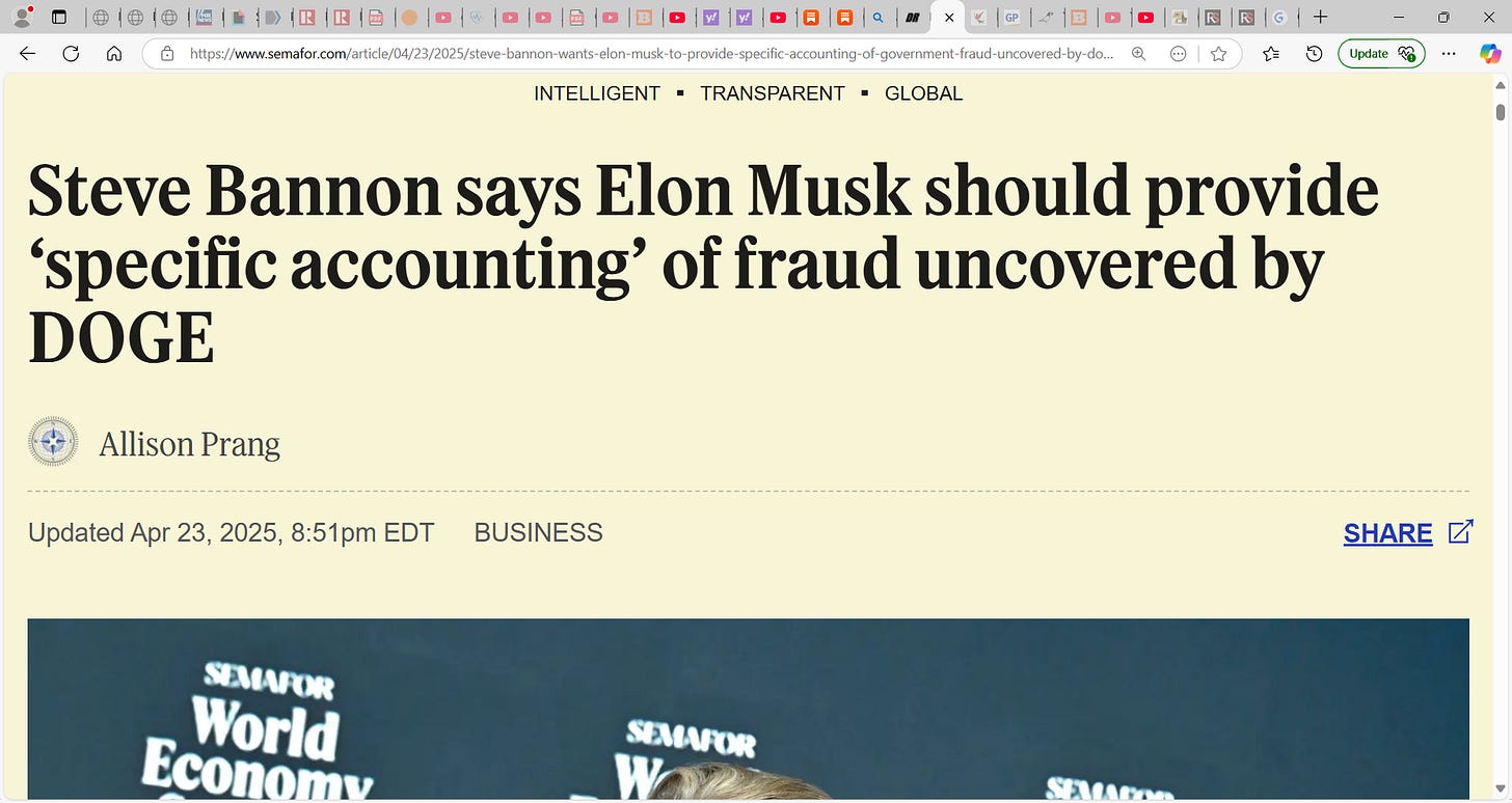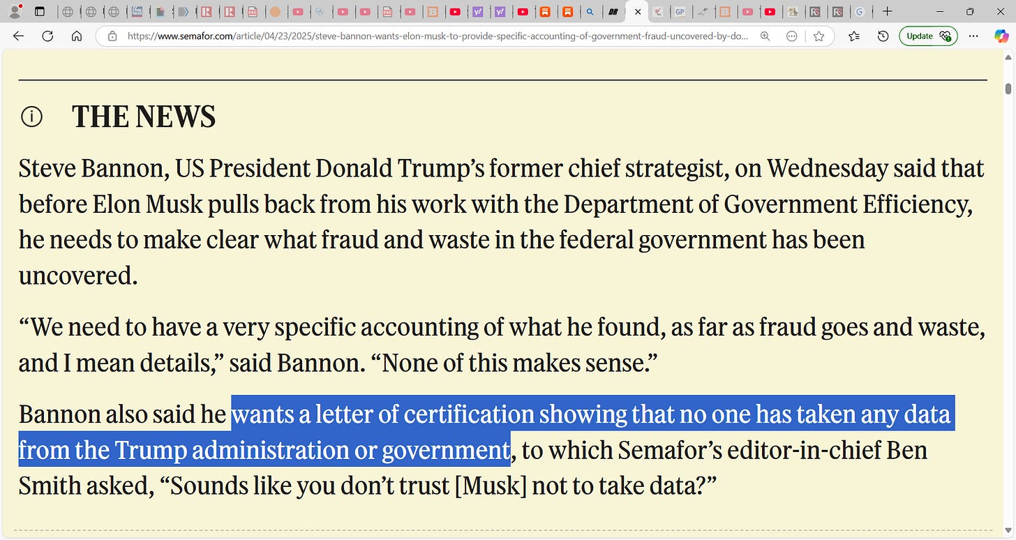 Steve Bannon says Elon Musk should provide ‘specific accounting’ of fraud uncovered by DOGE (I agree) & wants a letter of certification showing that no one has taken any data from the Trump admin