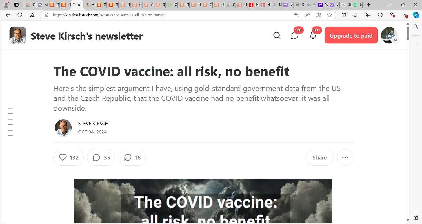 Steve Kirsch gets it & we disagree on some yet at times he is refreshing & returns to form as a PURE non-thieving money-whore grifter as his buddies are! "The COVID vaccine: all risk, no benefit";