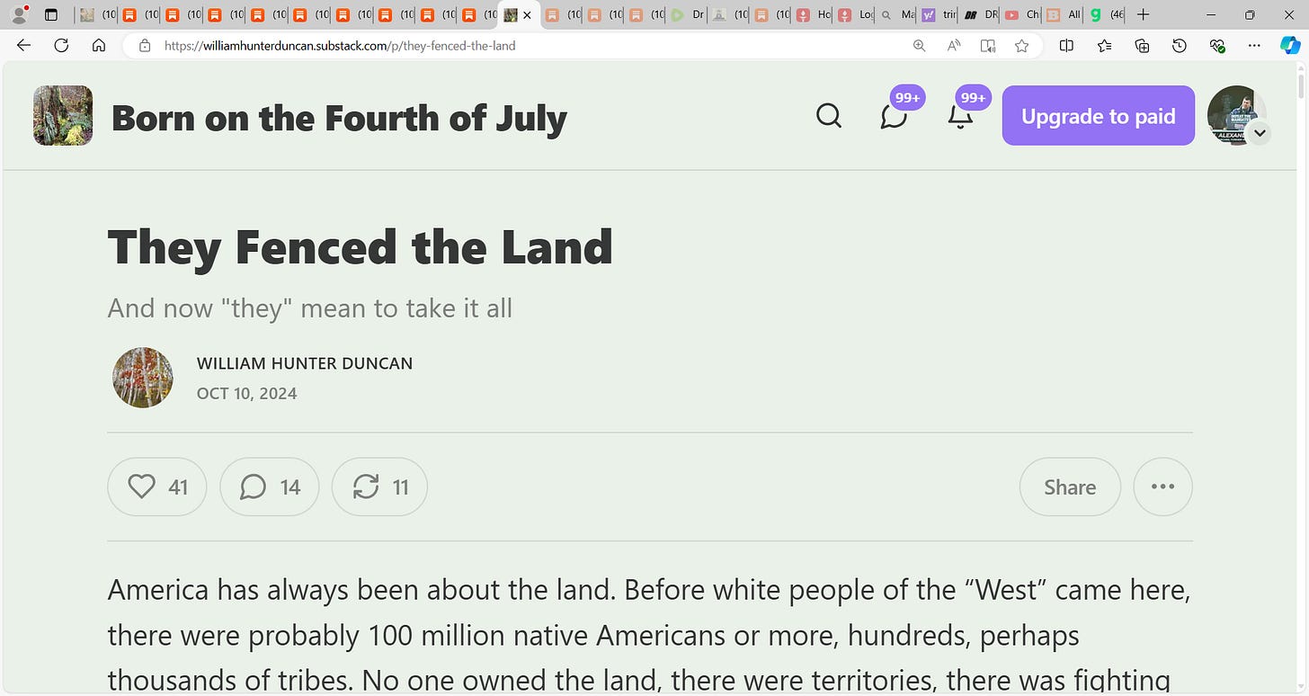 Stirring post 'They Fenced the Land And now "they" mean to take it all' by William Hunter Duncan; I love how Duncan writes & his statements in the comments are worth a section on its own so I share