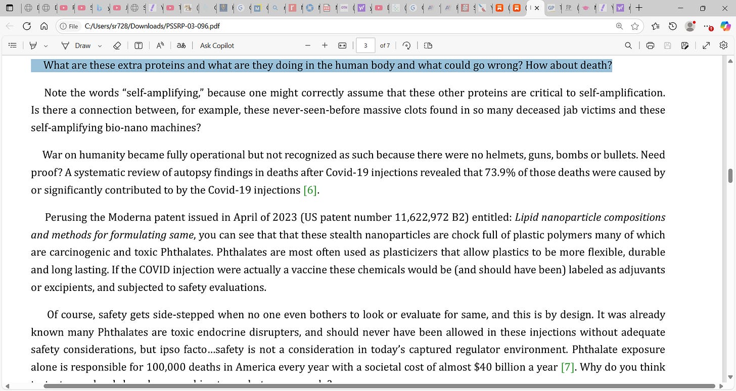 The manufacturers could legally lie about safety because in 2018 the legal definition of an adverse event was changed to being only something the medical literature or medical consensus had previously noted was an untoward sequelae of that injection. It would not have mattered if the injection gave every recipient myocarditis if that was not previously delineated - it would not be an adverse event. While few are aware the injections are making multiple proteins this fact is clearly spelled out by Pfizer itself. Granted Pfizer has zero to no credibility for anything they write or say, but they seem to be very transparent about revealing the injection is making “these ex tra proteins.” They are admitting to four additional proteins; however, there may be many more unintended, and undisclosed proteins being made. Pfizer very much wanted to keep their clinical data sealed for 75 years, so they had a lot to hide. What are these extra proteins and what are they doing in the human body and what could go wrong? How about death?’