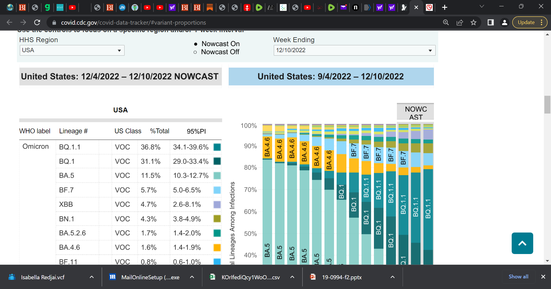 See the Variant Proportions as of today as reported by CDC. We see that BQ.1.1 and BQ.1 account for near 70% of the variants and BA.5 has declined to 11%. XBB is at 4.7%.