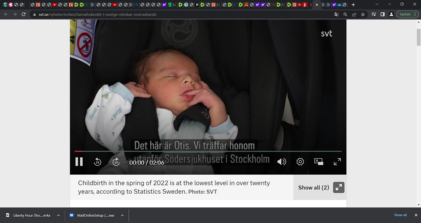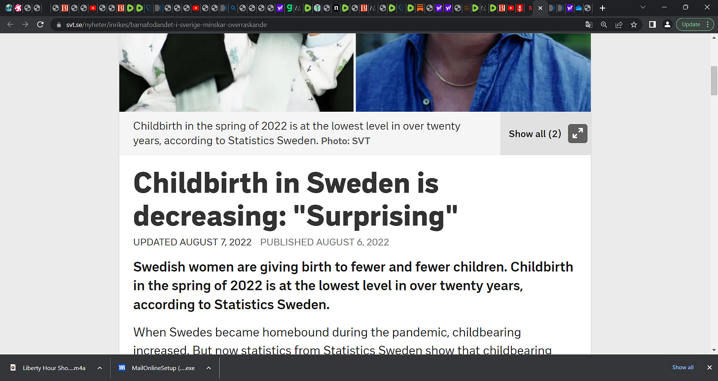 Swedish women are giving birth to fewer and fewer children. Why do you think? Could it be the COVID gene injection, impacting female and male fertility? Damaging sperm & the ovaries? I say YES!!!!!!!!