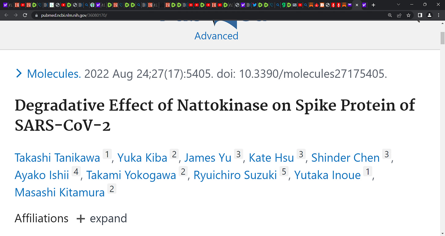 The Wellness Company (TWC) has a product called ‘Spike Recovery’ that comprises NATTO and these products should be considered to battle harmful effects e.g. clotting, of the virus and mRNA gene shot. Yes, the science is maturing but people need help now with safe formulations and NATTO etc. are natural fibrinolytics (blood thinners). Spike Recovery is safe, cheap, effective and may give the help needed. Those breast feeding, pregnant, on blood thinners, and persons under 18 should not use any supplement or drug unless cleared/discussed with their physician.