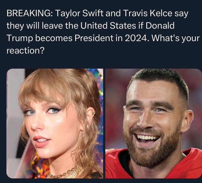 Taylor Swift and Travis Kelce ways they will leave America if Trump is elected? Well, shit, I did not know this, so IMO, you get to fuck out, and you stay out! and you never return! and when the