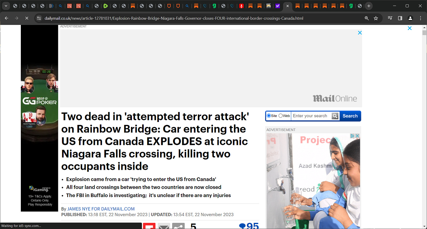 TERROR attack at Niagara Bridge US and Canada happening NOW? Rainbow Bridge? Was this a terror attack? By whom? Islamists? CAR from Canada; all bridges Canada to US now closed! Amen, keep it