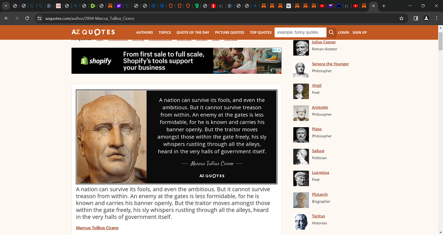 Is there indeed an asymmetrical 5th column working against us? Waging unconventional warfare from within the walls? Was Cicero 100% correct?