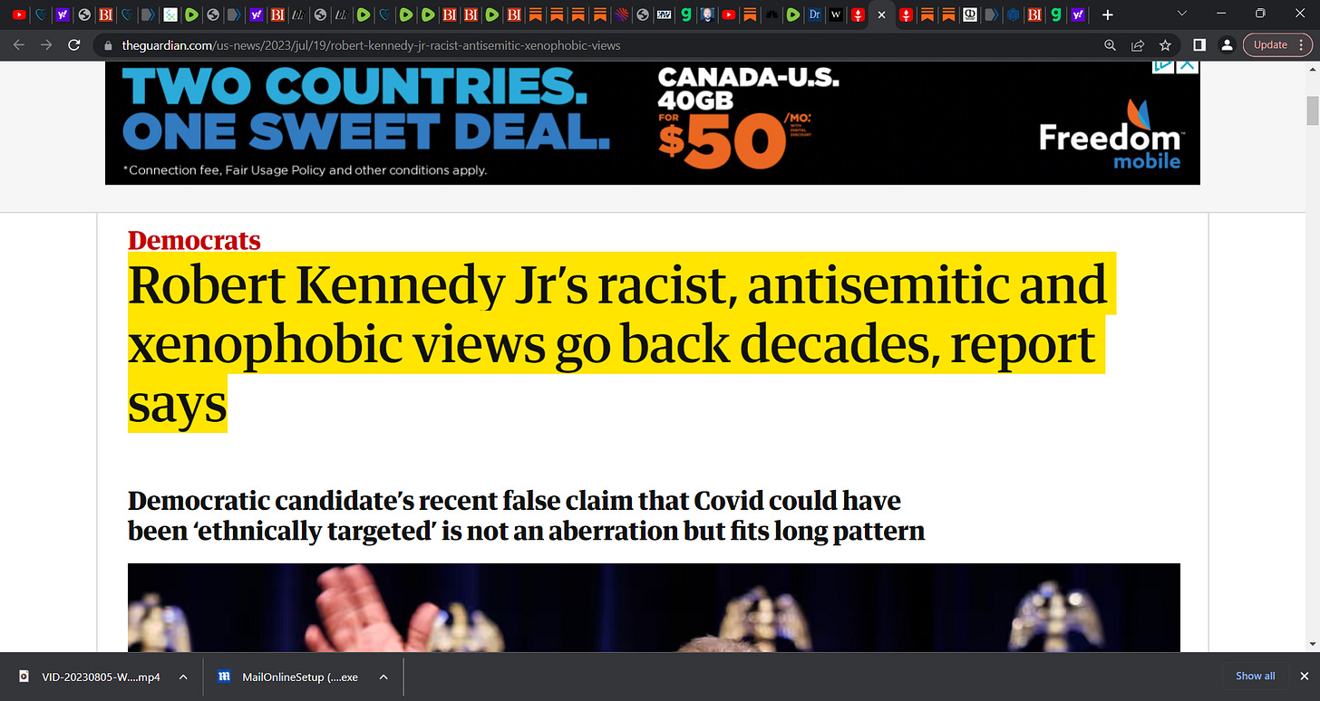 The Guardian is going full throttle against Bobby Kennedy Jr.; my take, when I check The 13 deadly Horsemen of the COVID Apocalypse list now circulating, I don't see Bobby's name; I am down with that!