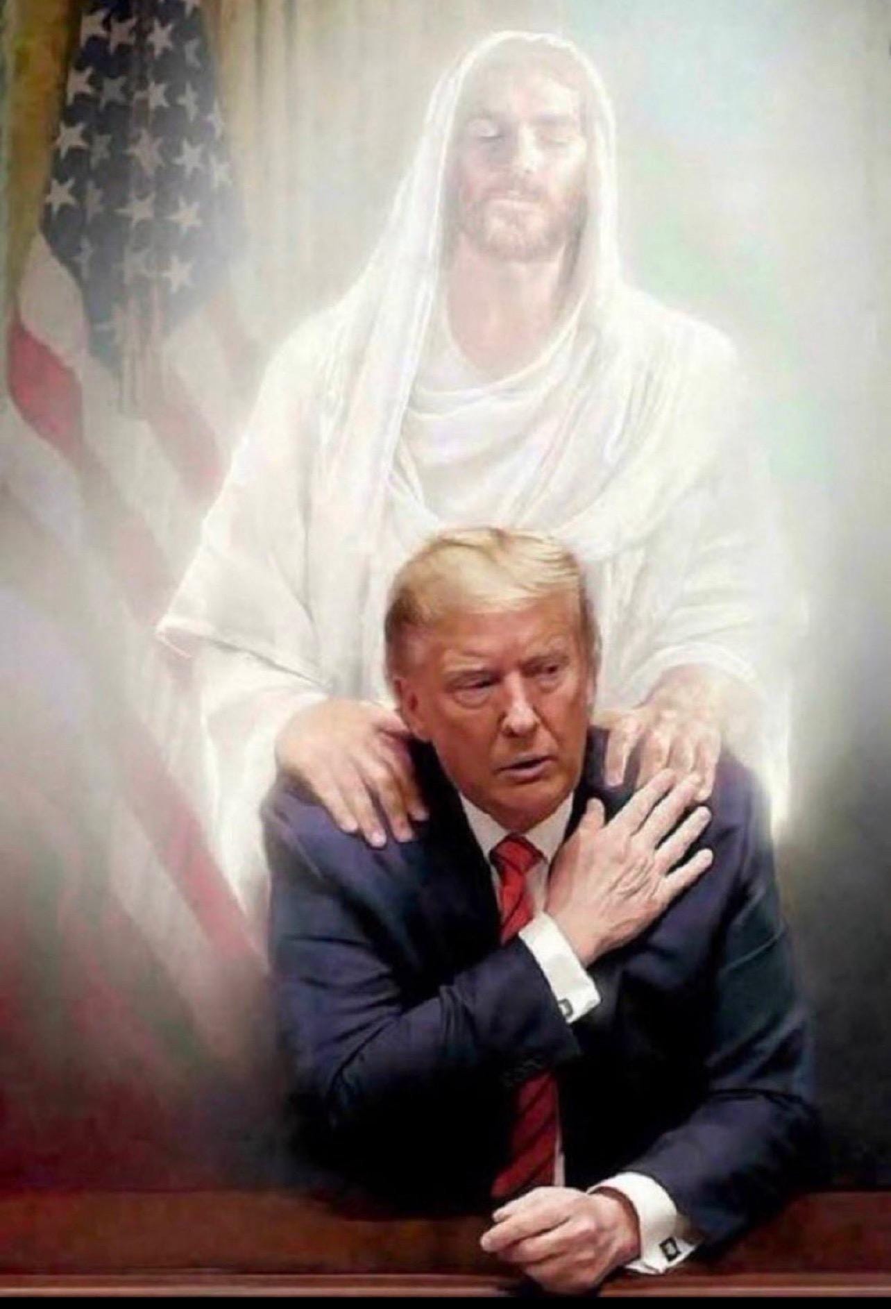 What a beautiful representation of Trump being shored up by Jesus in a time of trouble. Well done. Donald Trump's work on earth is OBVIOUSLY not yet done, as evidenced by the miraculous ear shot 13 Jul 2024, which failed in the intended purpose, to kill the next president of the U.S.A.