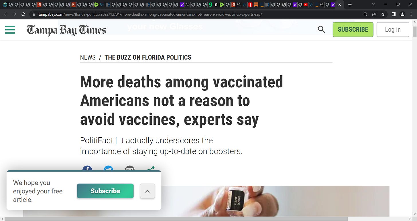 The lunacy of The Tampa Bay Times headline: "More deaths among vaccinated Americans not a reason to avoid vaccines, experts say"; can you grasp the lunacy of this title & even the reasoning when read