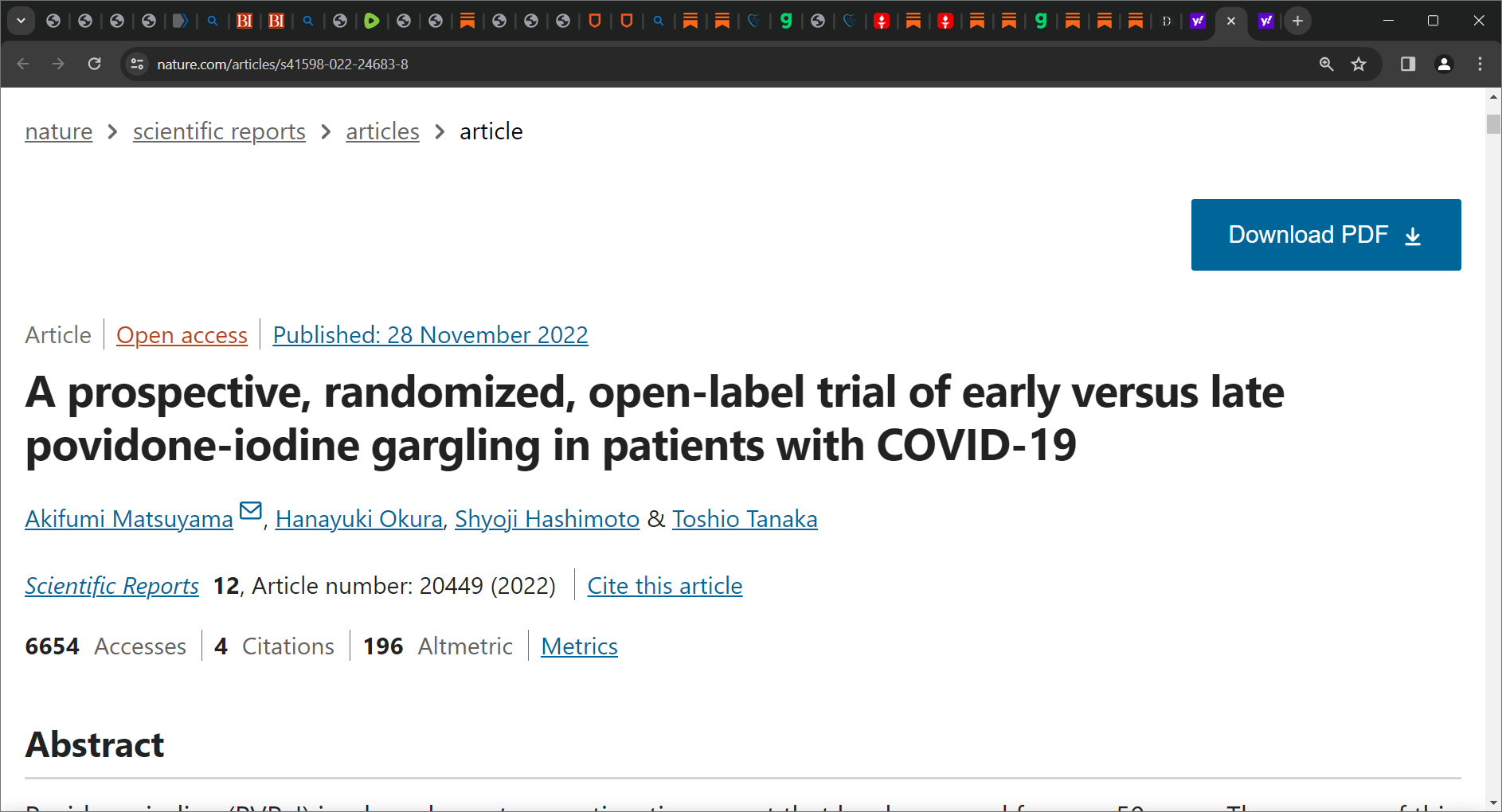 ‘On day 5, the early group had a significantly higher RT-qPCR negative rate than that of the late group (p = 0.015), and the early had a significantly higher clearance rate of infectivity (p = 0.025). During the PVP–I intervention, one participant reported oropharyngeal discomfort. Gargling with PVP–I may hasten virus clearance and reduce viral transmission via salivary droplets and aerosols in patients with asymptomatic-to-mild COVID-19.’