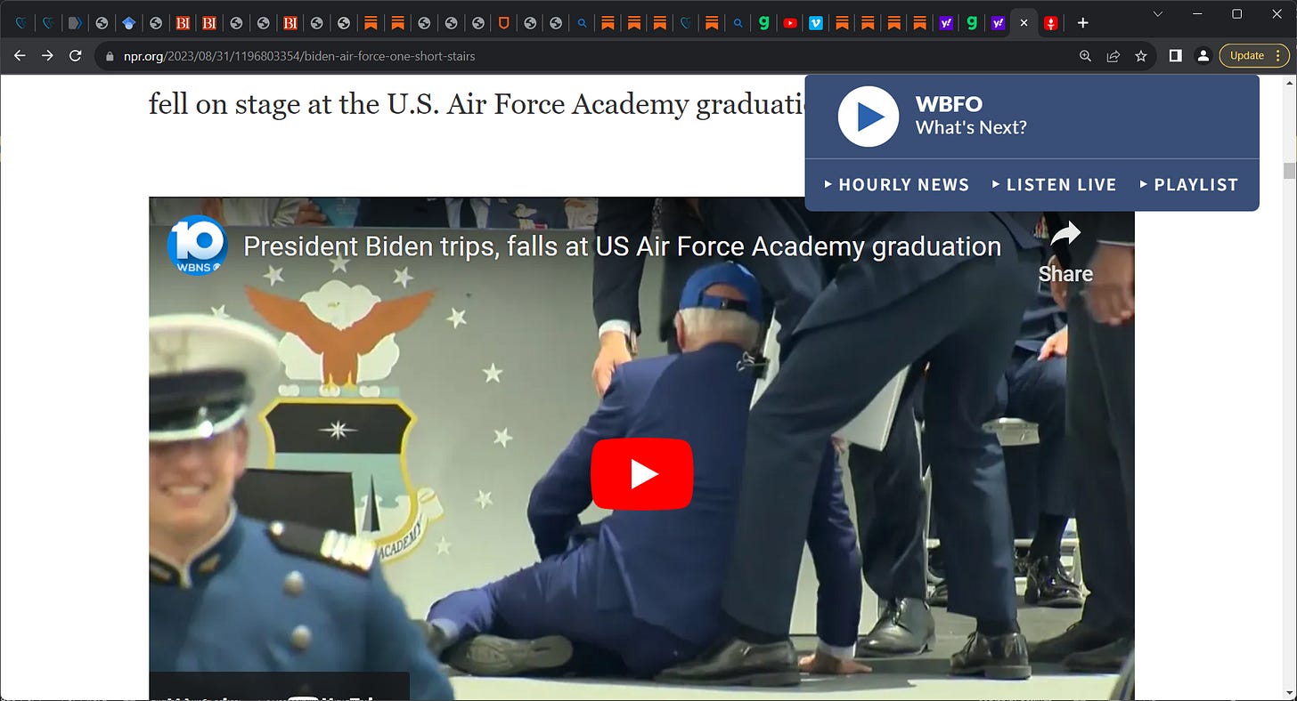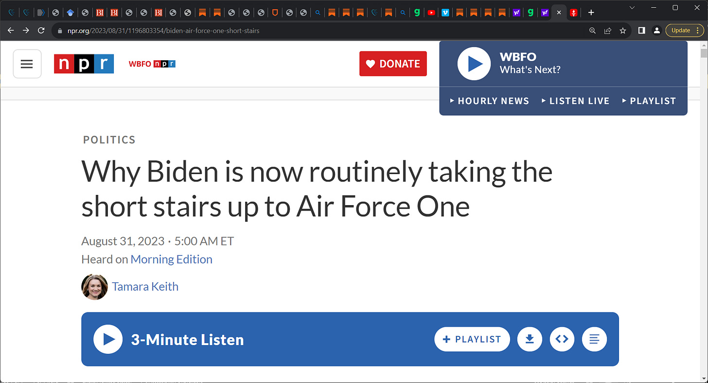 The optics of POTUS Biden falling repeatedly and now consigned to ONLY use the BABY short stairs from the underbelly of Air Force One is a BAD look! He has repeatedly fallen while climbing ICONIC Air