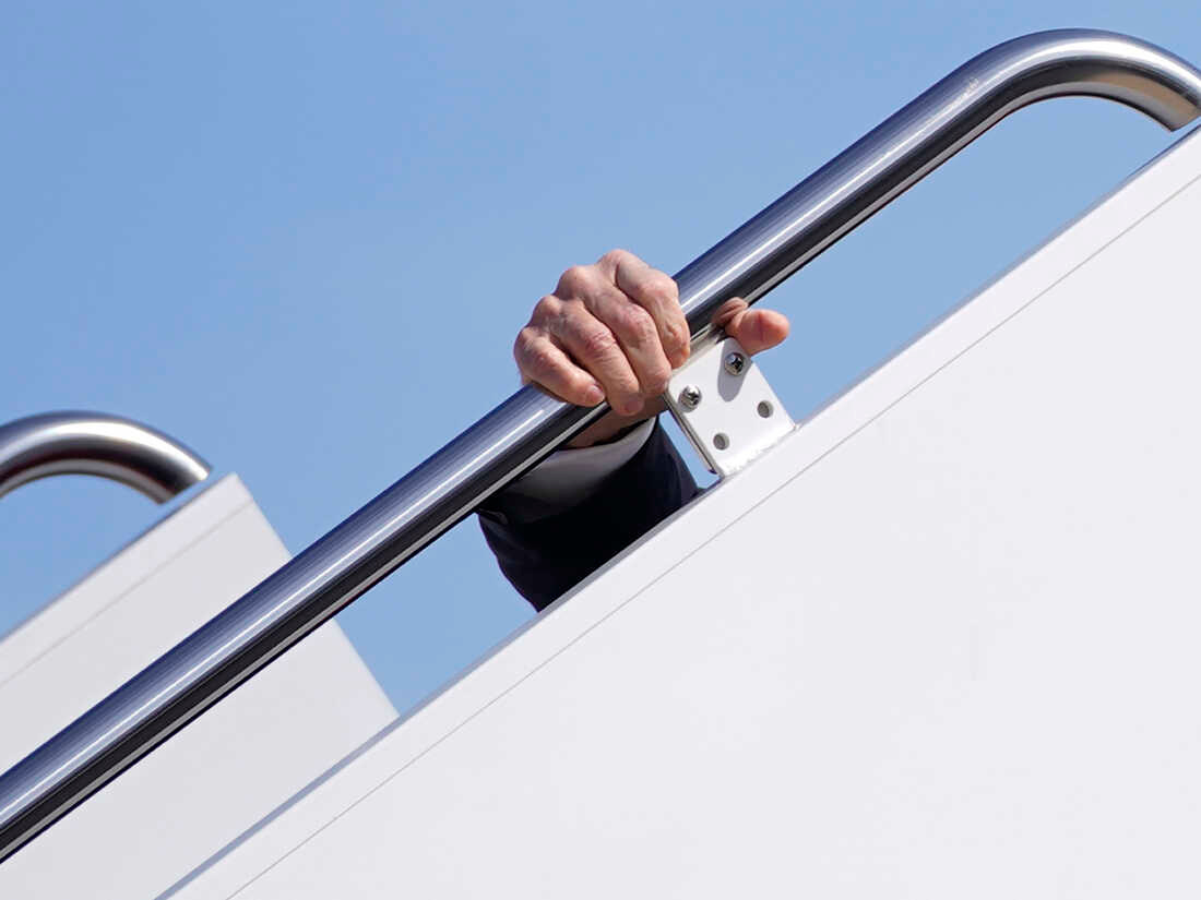 Force One steps; 'It's one of the iconic images of the American presidency: the commander in chief, standing and waving to cameras from the top of the stairs leading into Air Force One.' not for Joe!