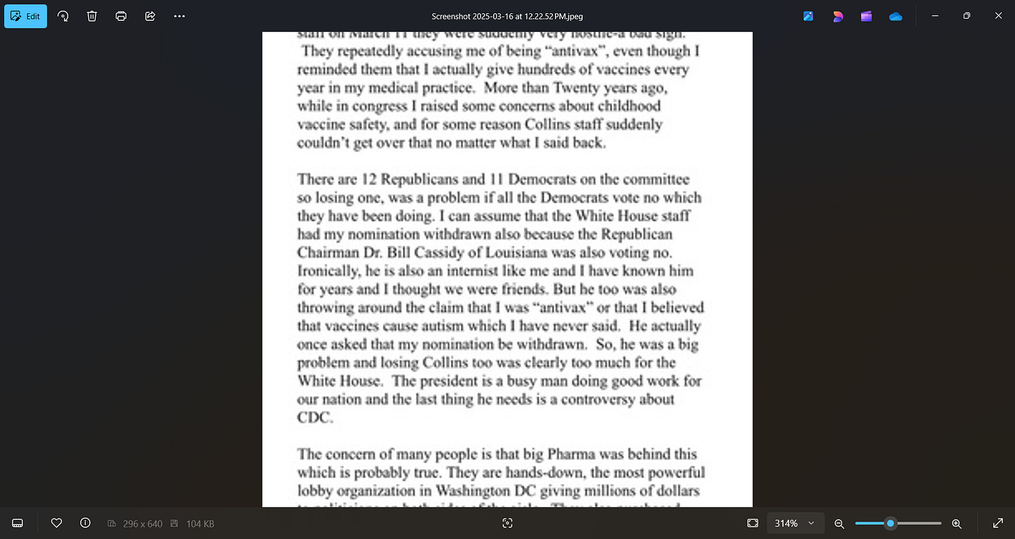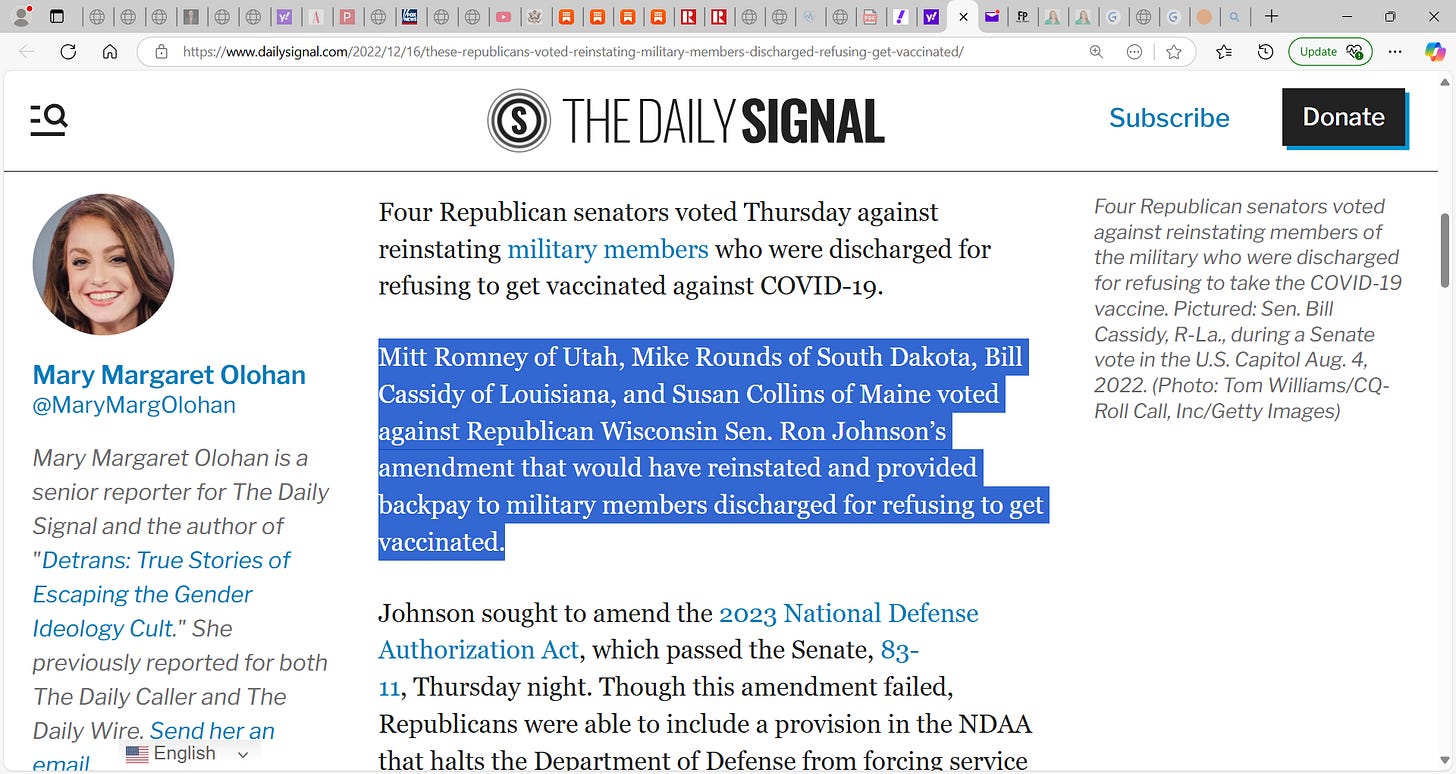 Why would the Trump administration pull this strong nominee? This is one I felt they WOULD want. But now we know that the pharma $$$ money owns them, own the congress house, owns the Senators. Follow the money. What was the role of Senator Bill Cassidy, MD (R-IL) in pulling this nominee? Four Republicans in their moments of madness prior voted against reinstating military members who were discharged for refusing to get vaccinated against COVID-19. They were ‘Mitt Romney of Utah, Mike Rounds of South Dakota, Bill Cassidy of Louisiana, and Susan Collins of Maine voted against Republican Wisconsin Sen. Ron Johnson’s amendment that would have reinstated and provided backpay to military members discharged for refusing to get vaccinated.’ Thank God for Senator Ron Johnson. Excellent reporting by Mary Margaret Olohan of The Daily Signal.