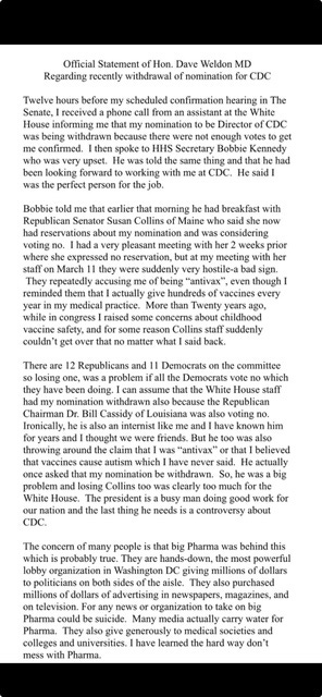 The PHARMA lobby, vaccine & drug makers like Pfizer, Moderna, Bourla, Bancel, Malone, Sahin, BioNTech, Glaxo etc. worked to defeat RFK's nominee Dr. Dave Weldon as head of CDC; this was devastating!