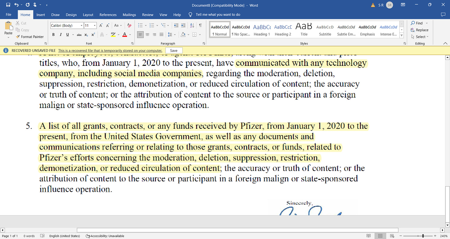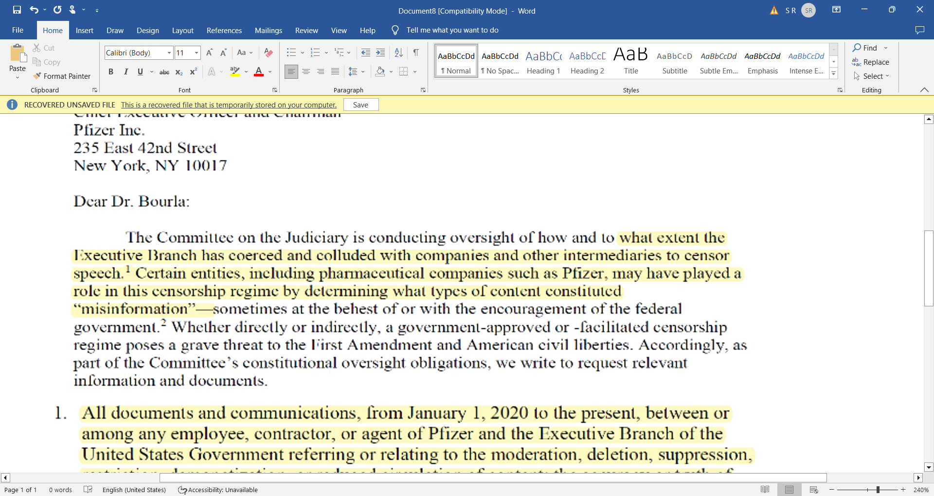 ‘The noose is tightening around Pfizer’s European veterinarian CEO Albert Bourla. He has not faced a single hard question on the Hill but finally has received a request from House Judiciary Chairman Jim Jordan (R-OH) to produce documents and contacts on how the pharmaceutical giant colluded with the Executive Branch and social media companies (Twitter, Gettr, Facebook, Telegram, Instagram etc.) by weaponizing “misinformation” in order to push mRNA vaccines.’