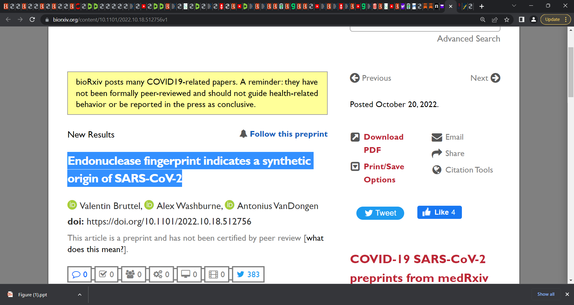 Plot thickens & strengthens for lab-engineered origin of COVID virus & not wet-market spillover zoonoses; Washburne & Bruttel: "Endonuclease fingerprint indicates a synthetic origin of SARS-CoV-2"