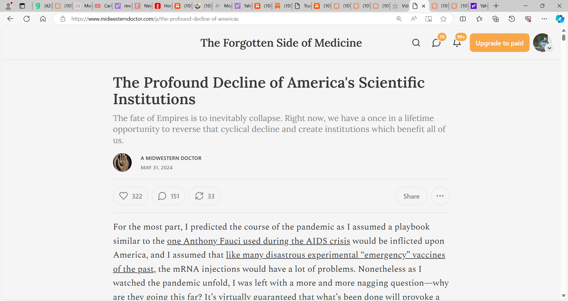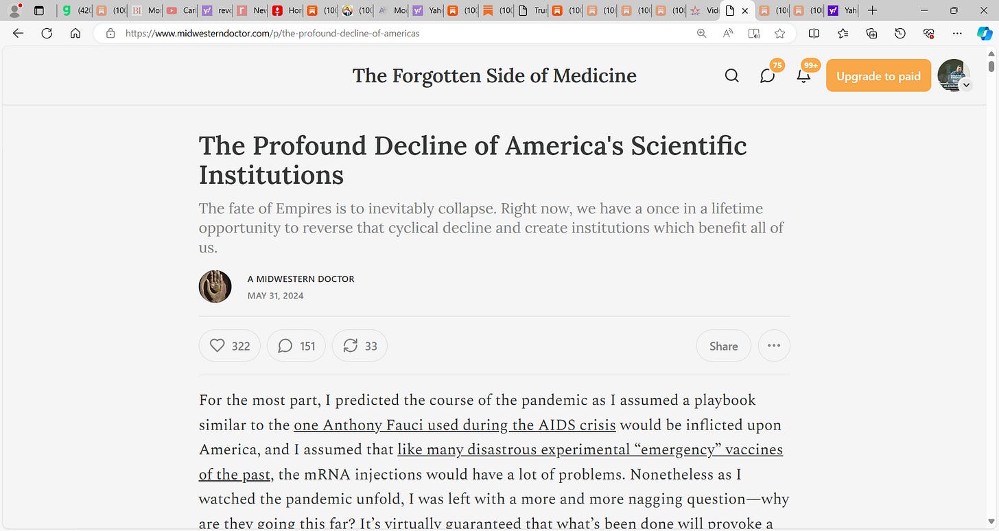 and create institutions which benefit all of us.' Once again outstanding scholarship and substack by A Midwestern Doctor, extolling us on the dysfunction and decline and fall of US's research arena