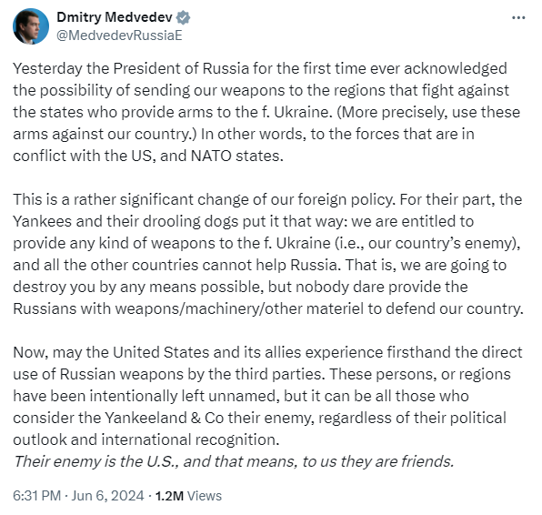 ‘Yesterday the President of Russia for the first time ever acknowledged the possibility of sending our weapons to the regions that fight against the states who provide arms to the f. Ukraine. (More precisely, use these arms against our country.) In other words, to the forces that are in conflict with the US, and NATO states.’